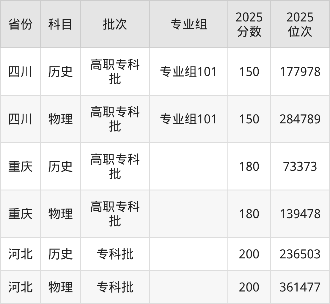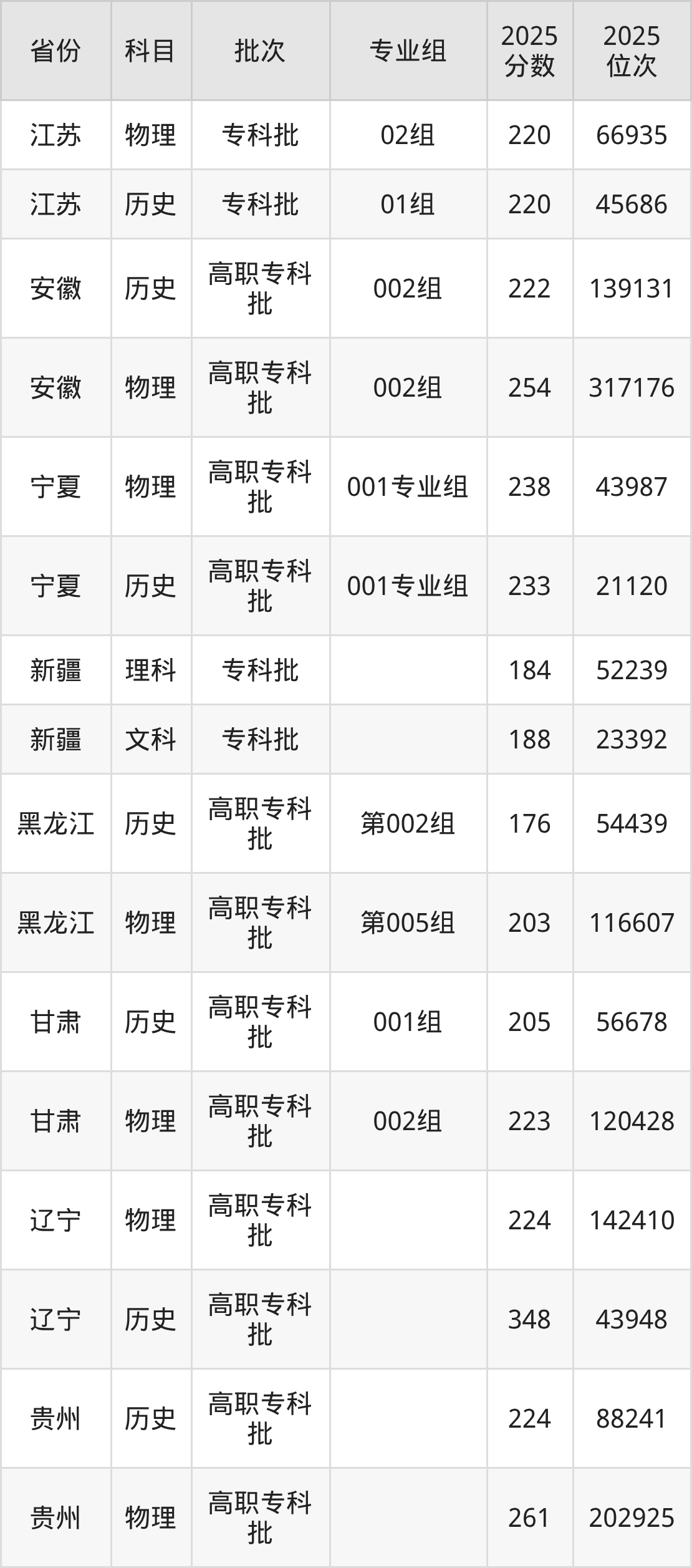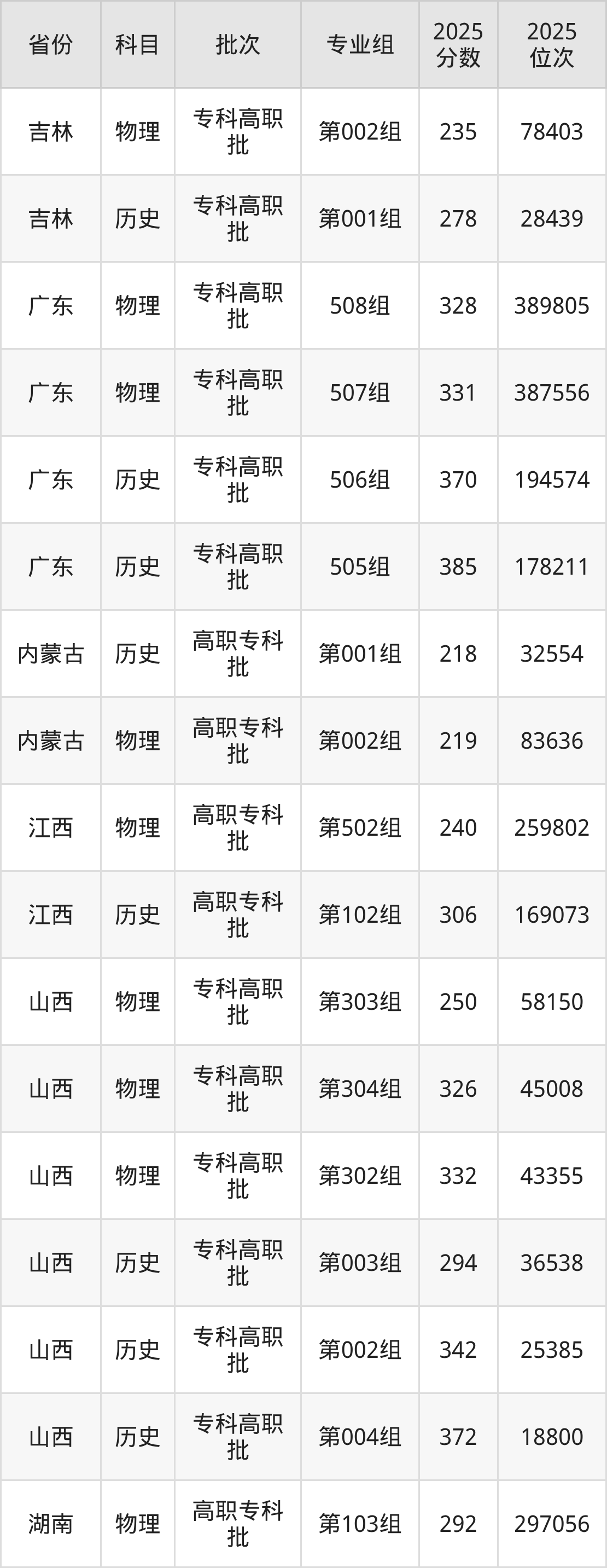 2025年在专科物理类进行招生,各专业组分数线详情如下: