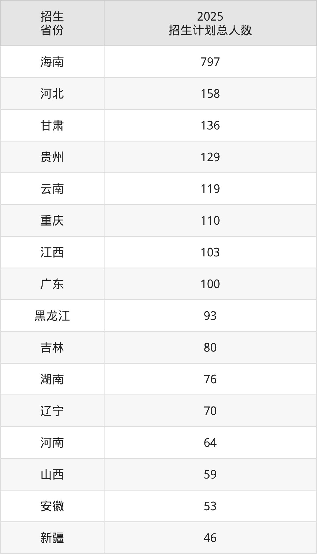 2025年三亚航空旅游职业学院面向全国24个省市开展专科招生;招生专业共34个,招生人数共2493人。2025年在海南省招生计划总人数是797人,其中,三亚航空旅游职业学院在海南省招生人数最多的是飞机机电设备维修。三亚航空旅游职业学院在各省具体招生人数情况如下表。