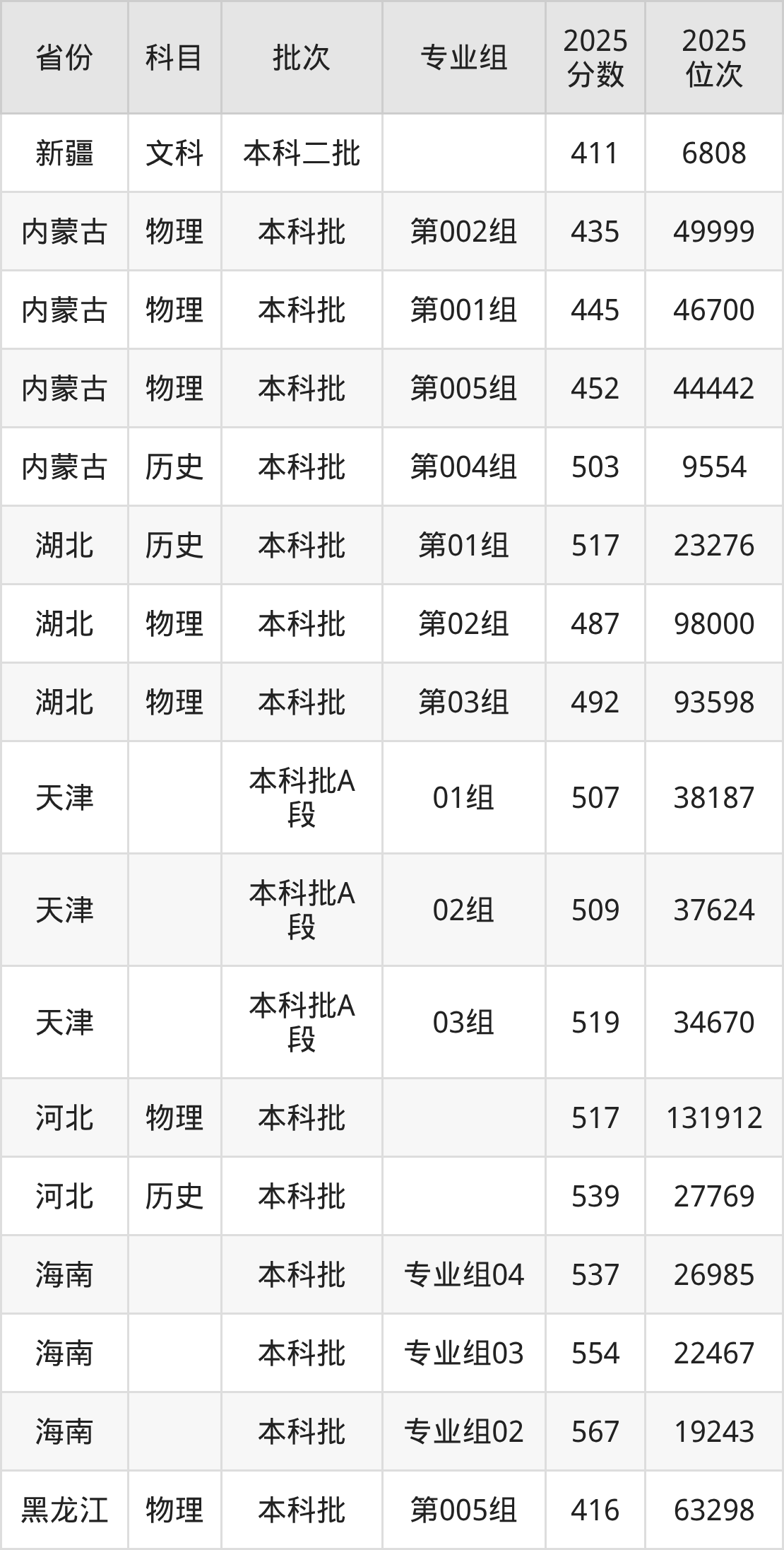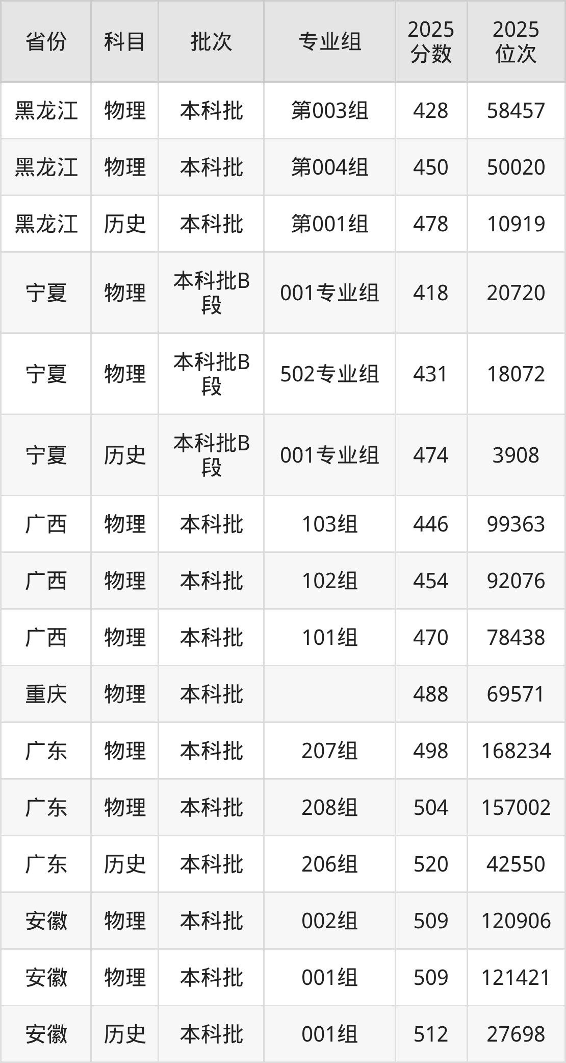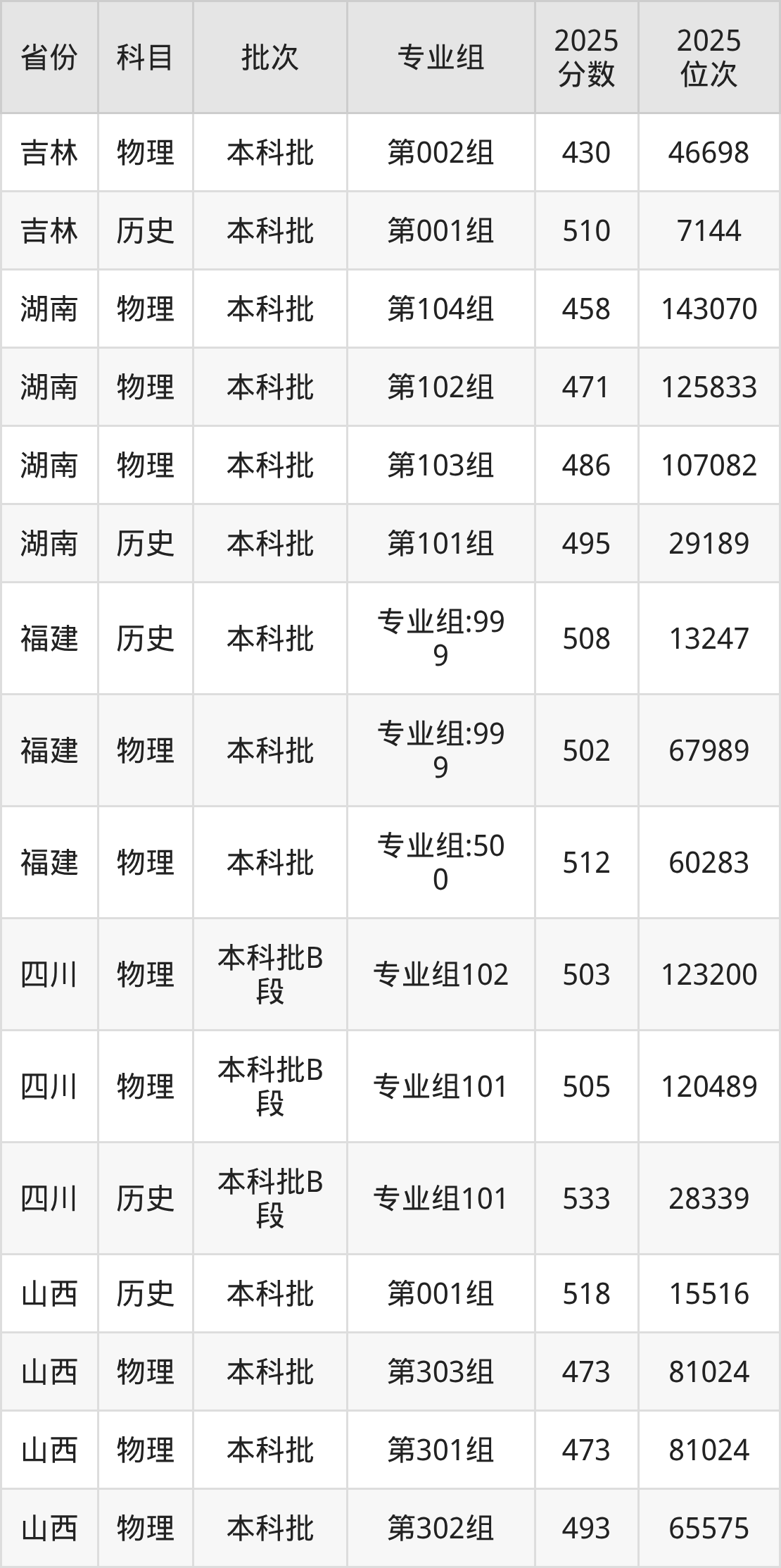 2025年在本科物理类进行招生,各专业组分数线详情如下: