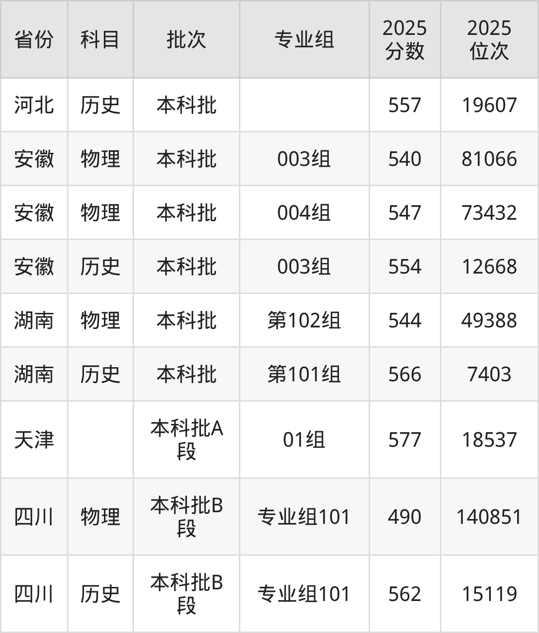 安徽财经大学003组:2025年投档录取最低分为540分,录取最低位次为81066名。