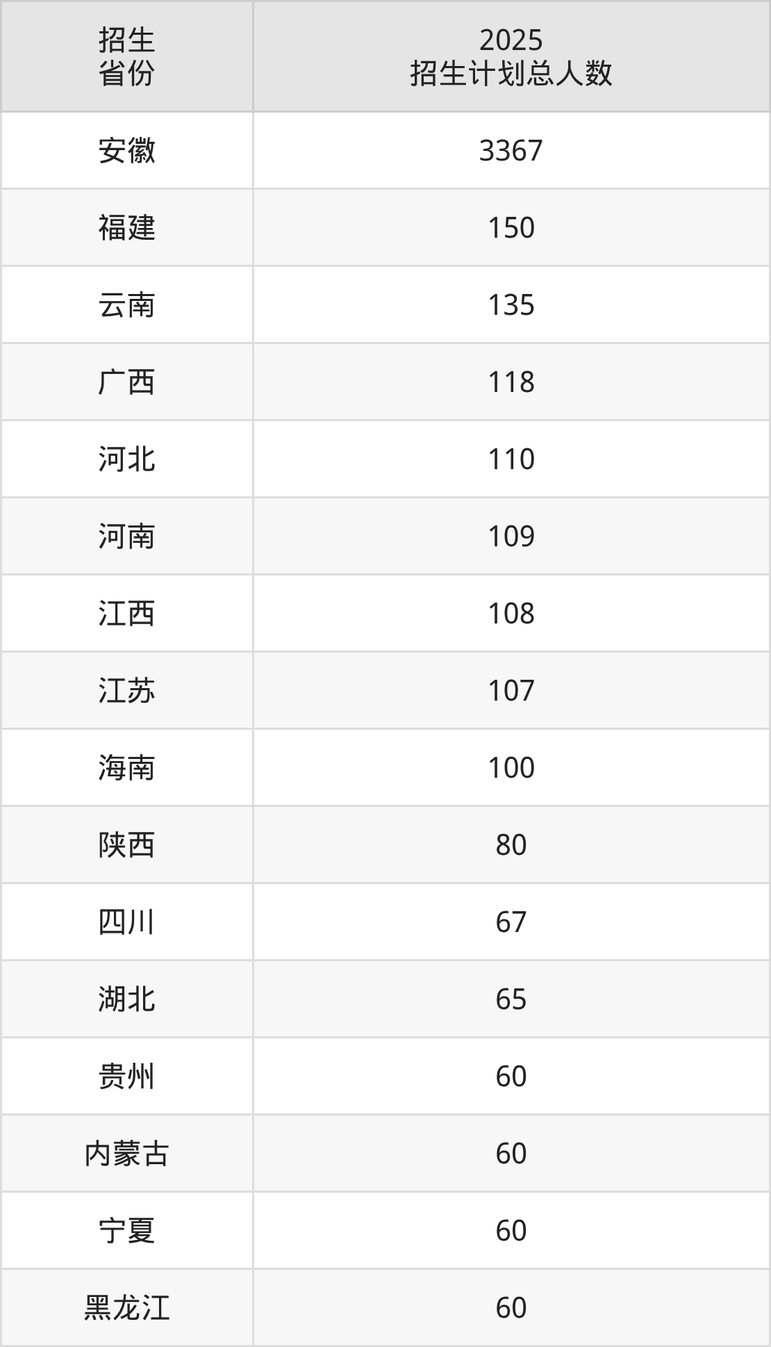 2025年安徽财经大学面向全国28个省市开展本科招生;招生专业共33个,招生人数共5177人。2025年在安徽省招生计划总人数是3367人,其中,安徽财经大学在安徽省招生人数最多的是计算机类。安徽财经大学在各省具体招生人数情况如下表。
