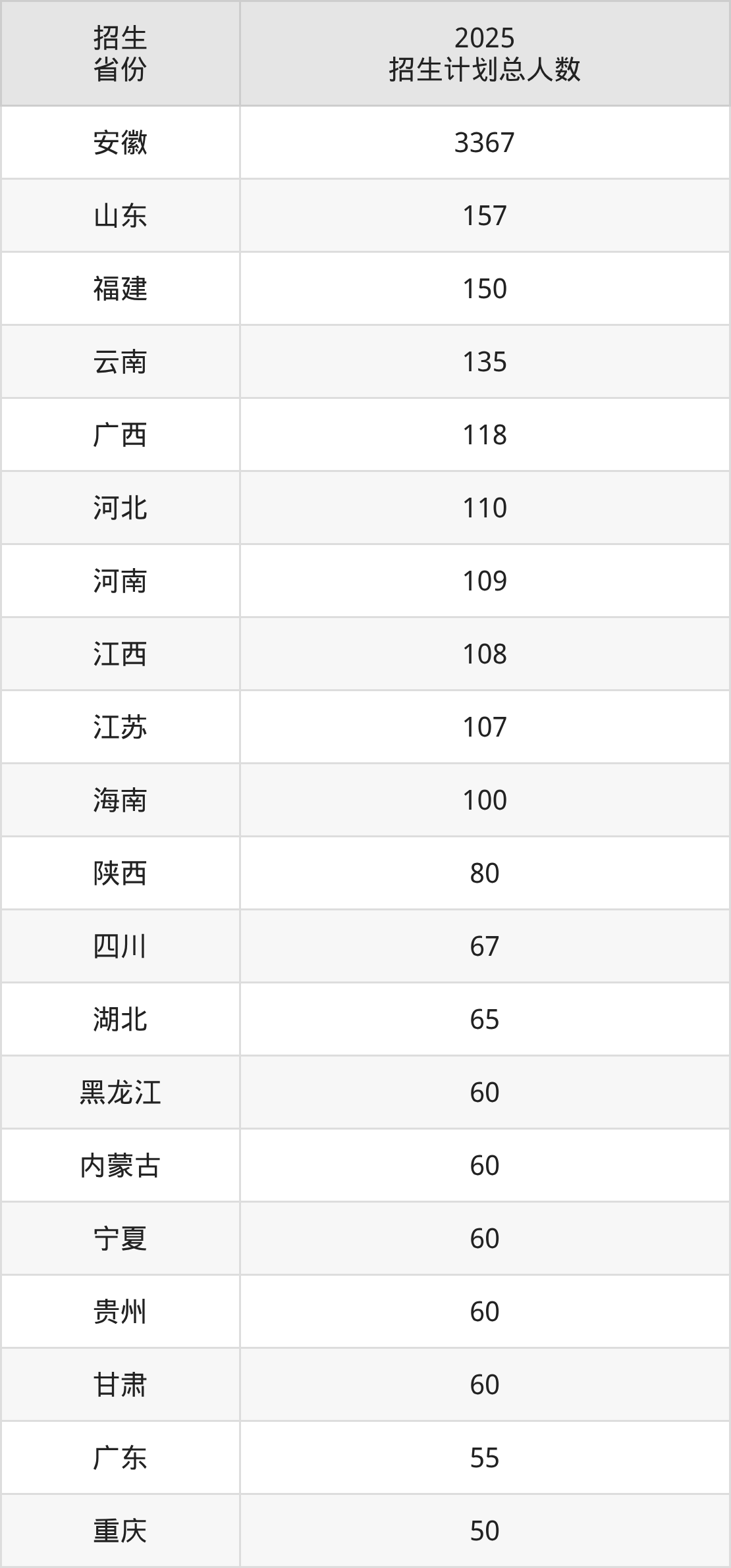 2025年安徽财经大学面向全国29个省市开展本科招生;招生专业共33个,招生人数共5334人。2025年在安徽省招生计划总人数是3367人,其中,安徽财经大学在安徽省招生人数最多的是计算机类。安徽财经大学在各省具体招生人数情况如下表。