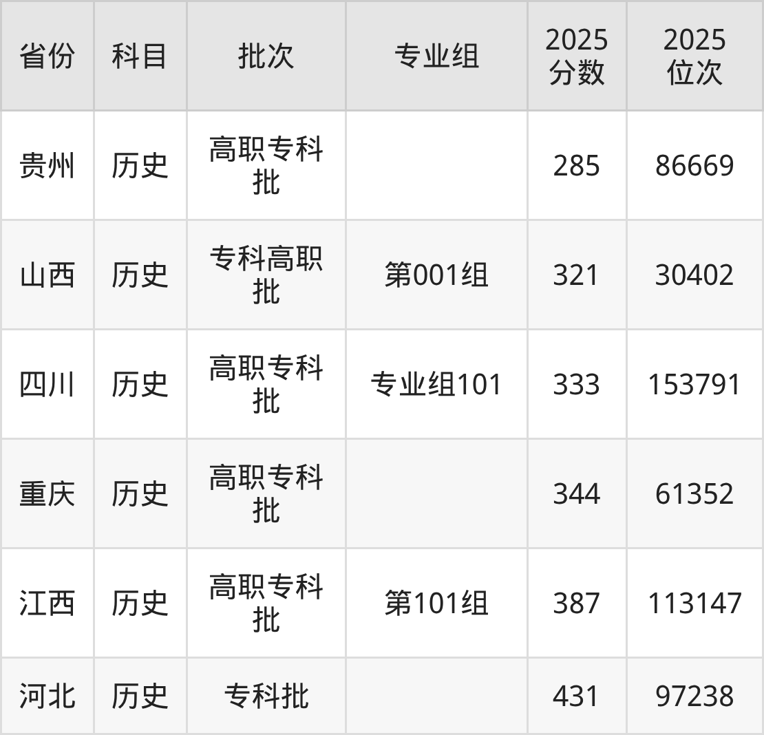 2025年在专科历史类进行招生,各专业组分数线详情如下: