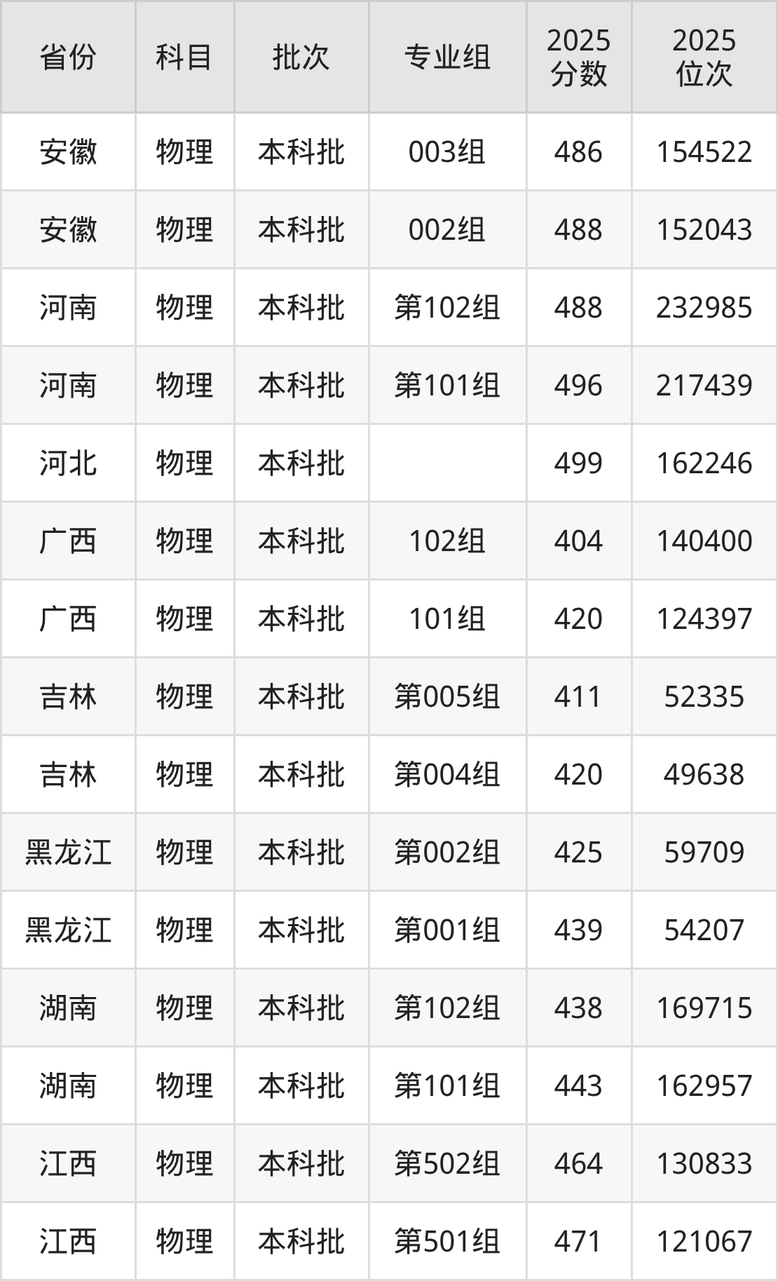 2025年在本科物理类进行招生,各专业组分数线详情如下: