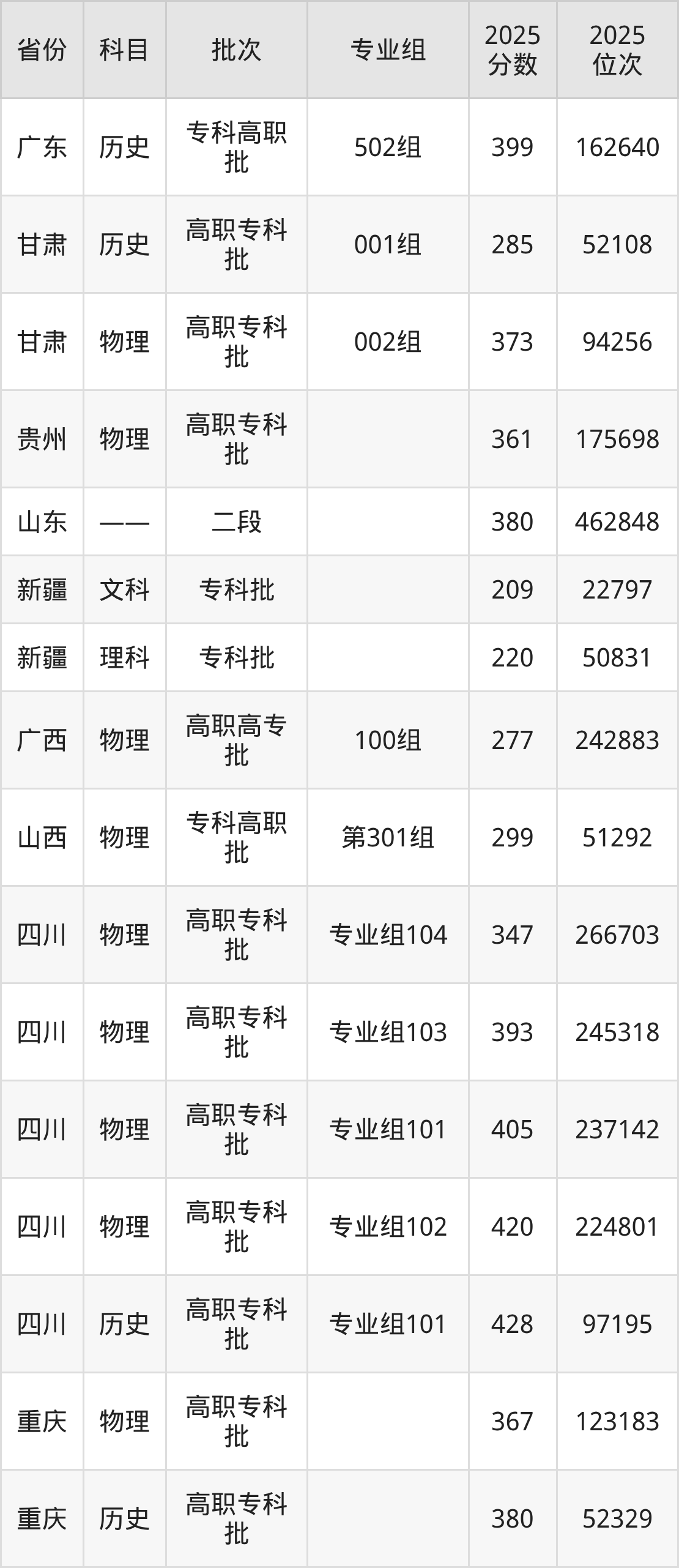 2025年在专科物理类进行招生,各专业组分数线详情如下: