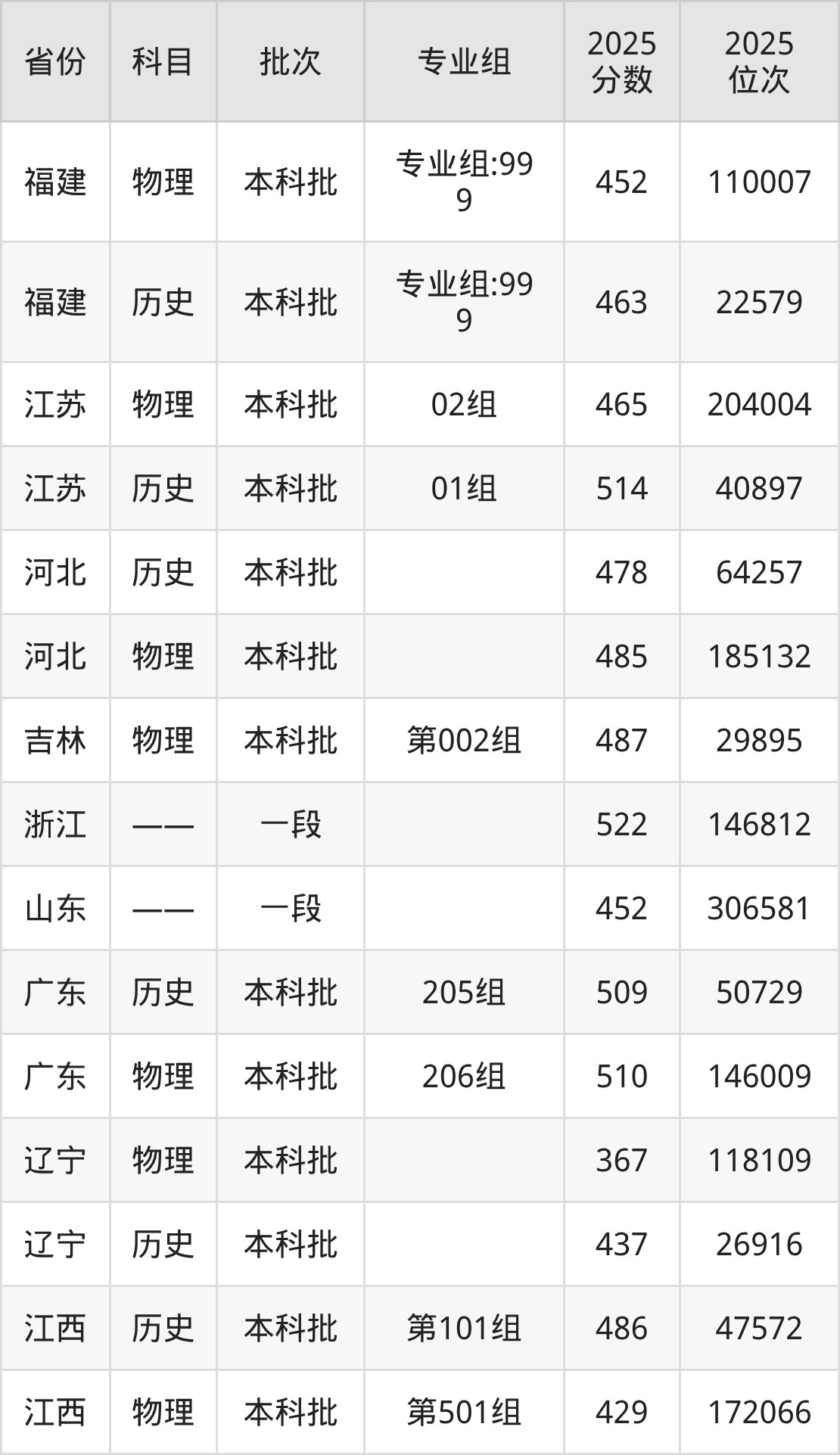 2025年在本科物理类进行招生,各专业组分数线详情如下: