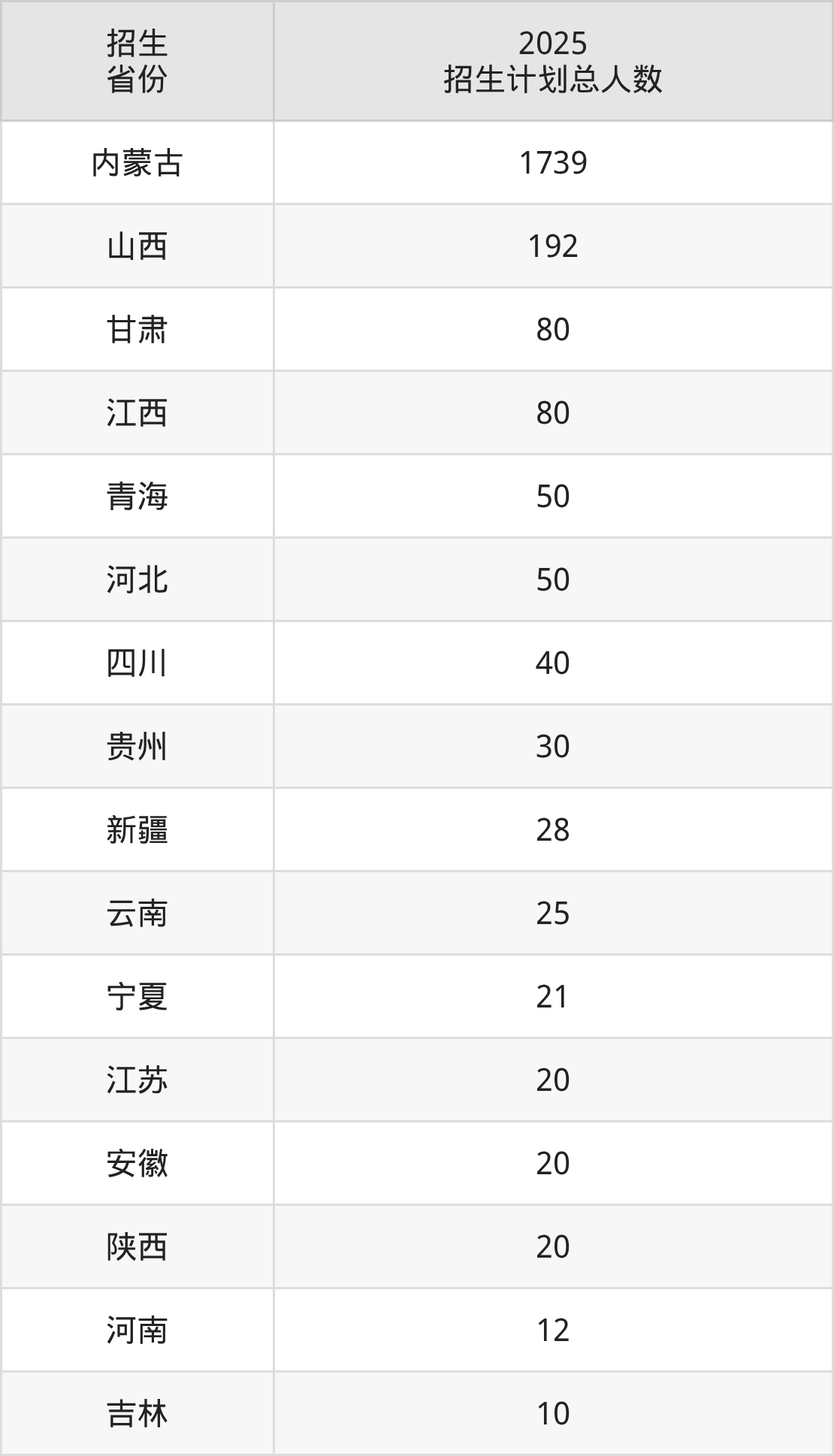 2025年包头铁道职业技术学院面向全国20个省市开展专科招生;招生专业共21个,招生人数共2439人。2025年在内蒙古自治区招生计划总人数是1739人,其中,包头铁道职业技术学院在内蒙古自治区招生人数最多的是铁道交通运营管理。包头铁道职业技术学院在各省具体招生人数情况如下表。
