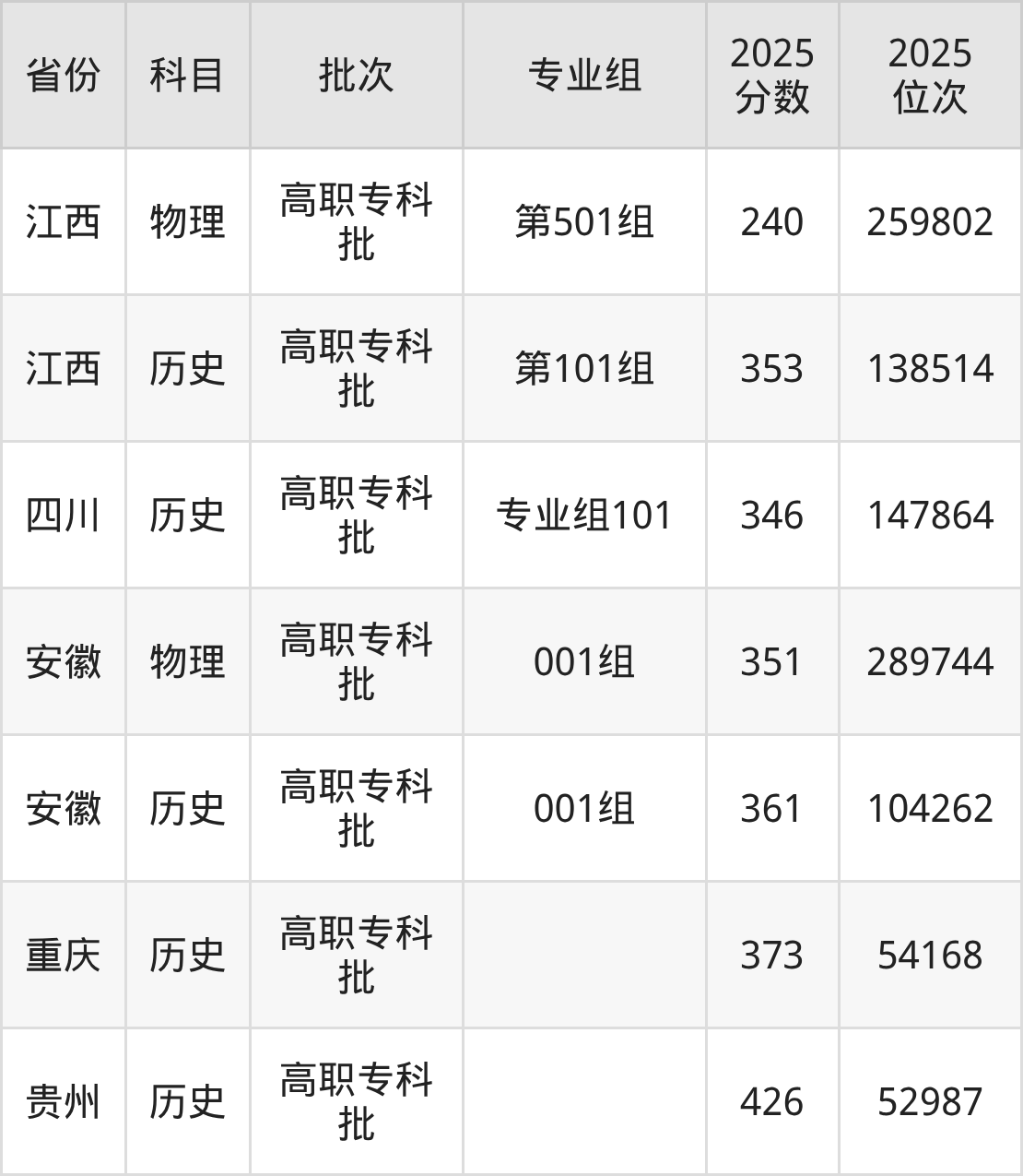 2025年在专科历史类进行招生,各专业组分数线详情如下: