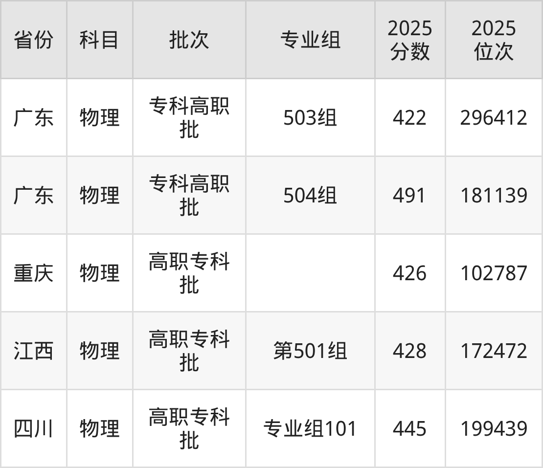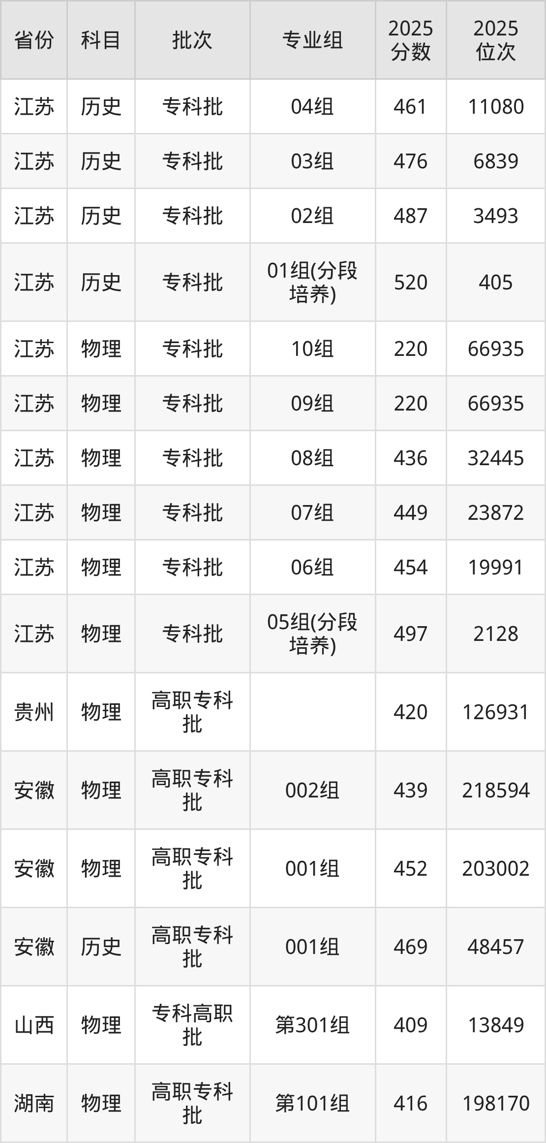 2025年在专科物理类进行招生,各专业组分数线详情如下: