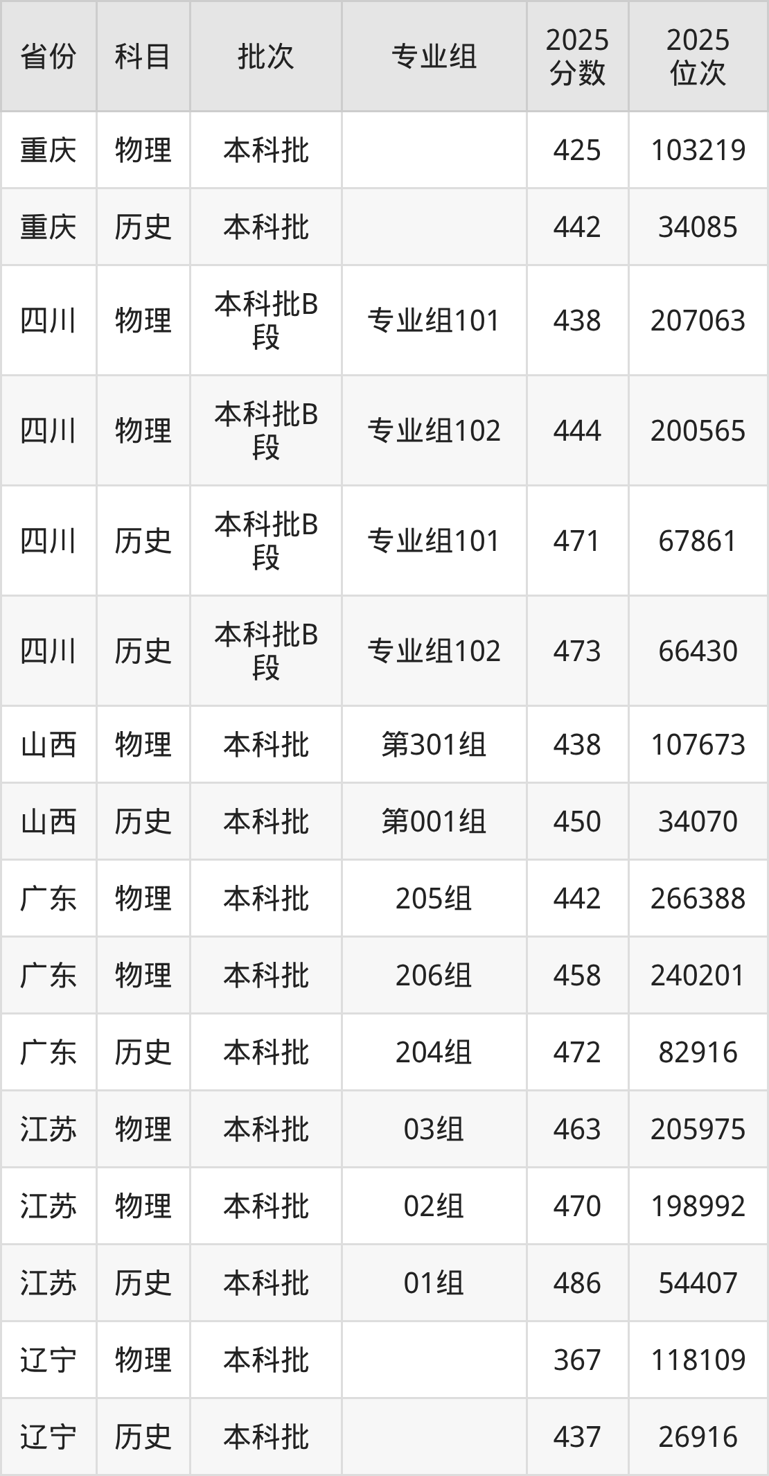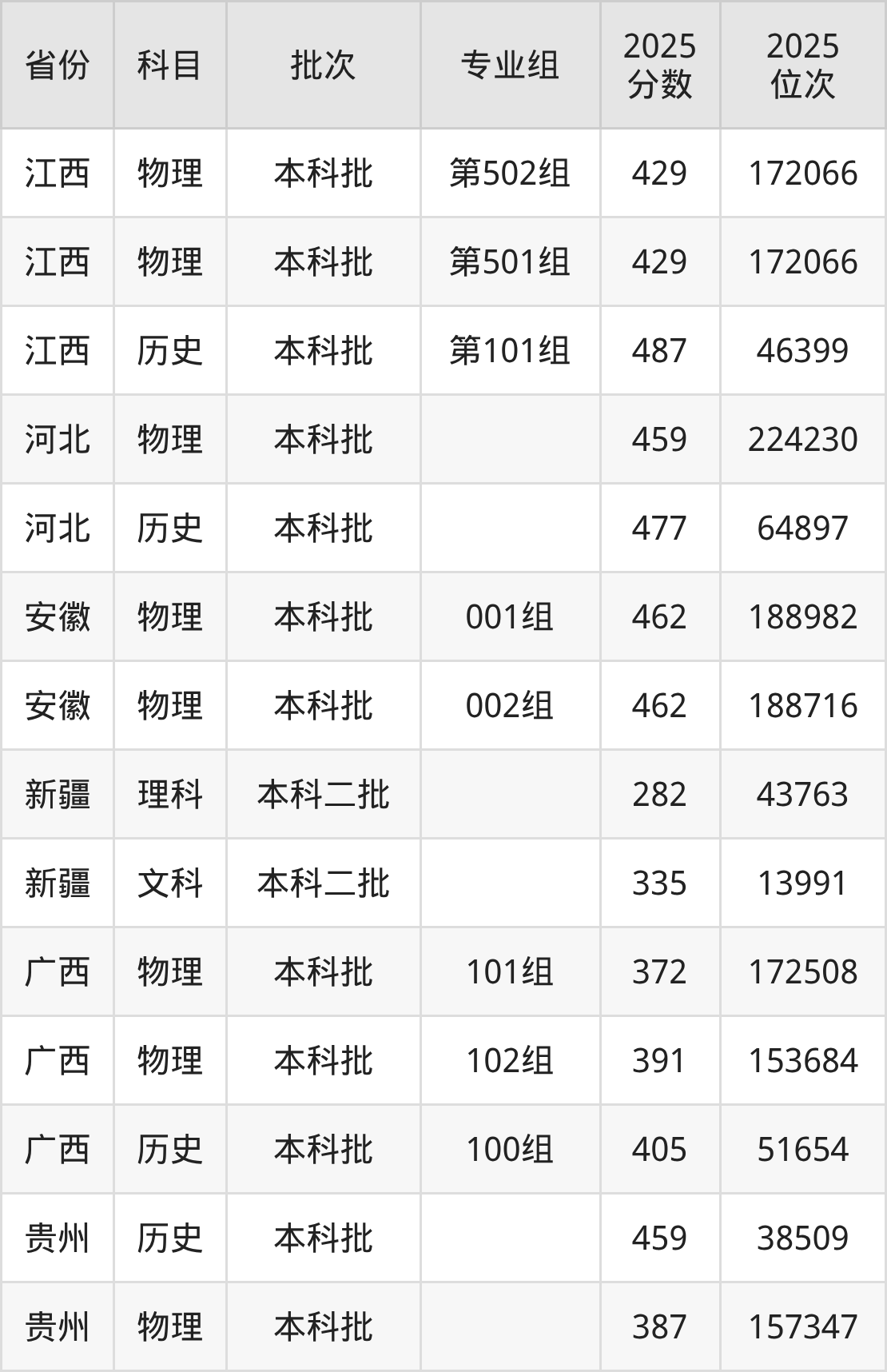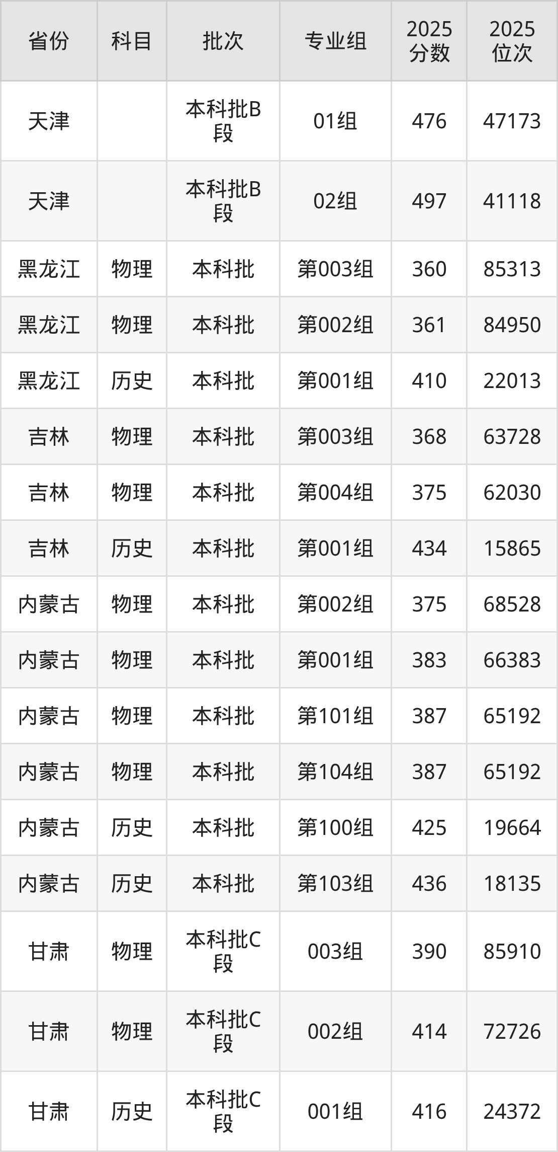 2025年在本科物理类进行招生,各专业组分数线详情如下: