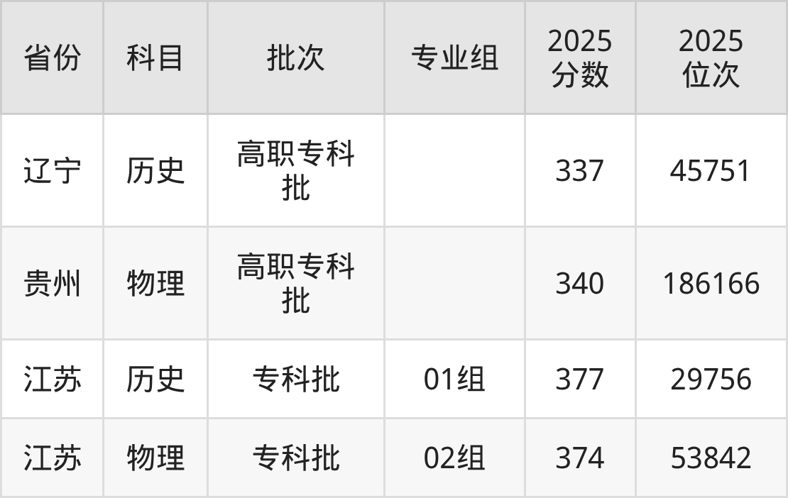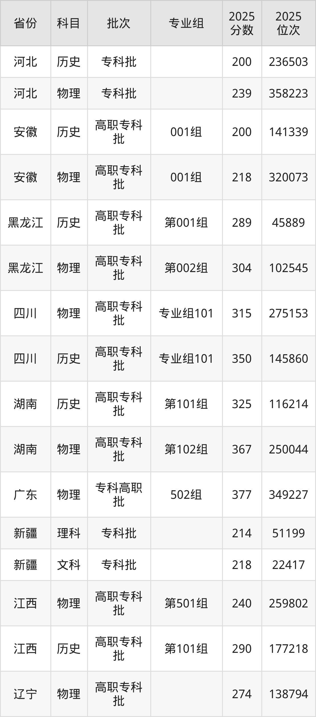 2025年在专科物理类进行招生,各专业组分数线详情如下: