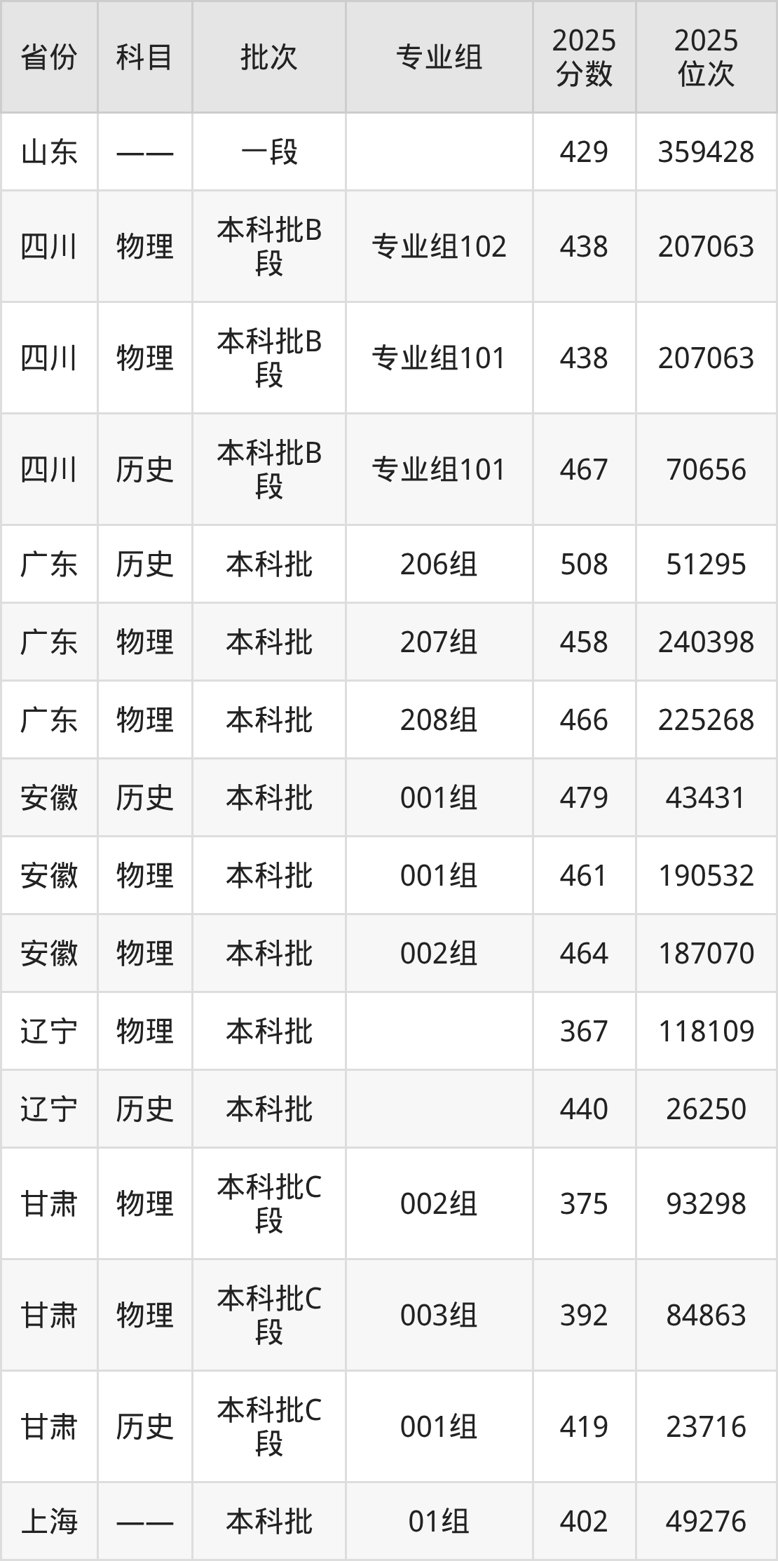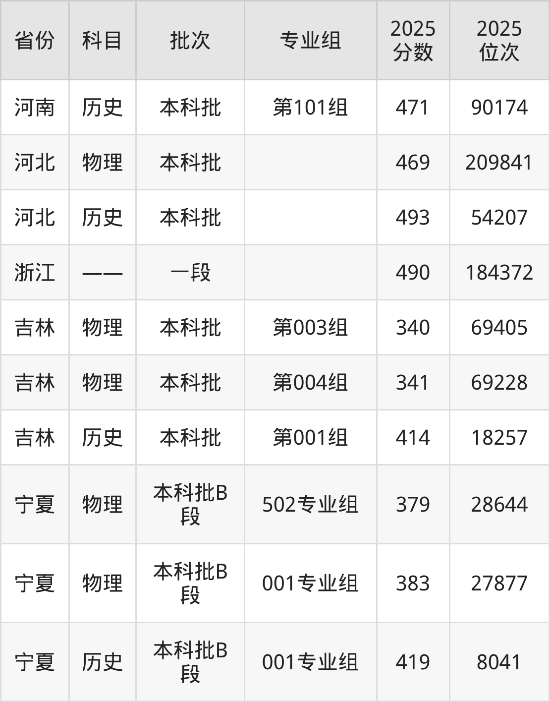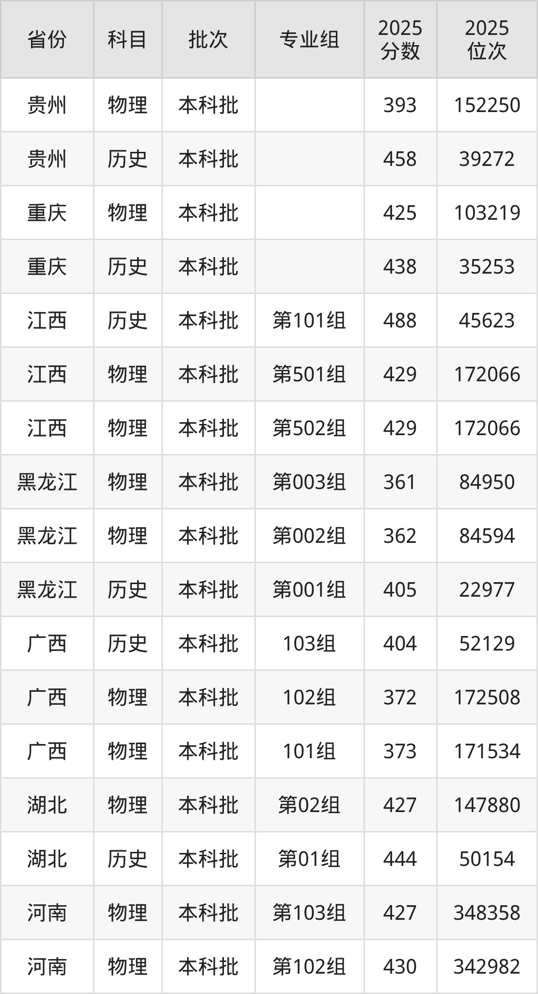 普通类本科物理类最低393分,本科历史类最低458分