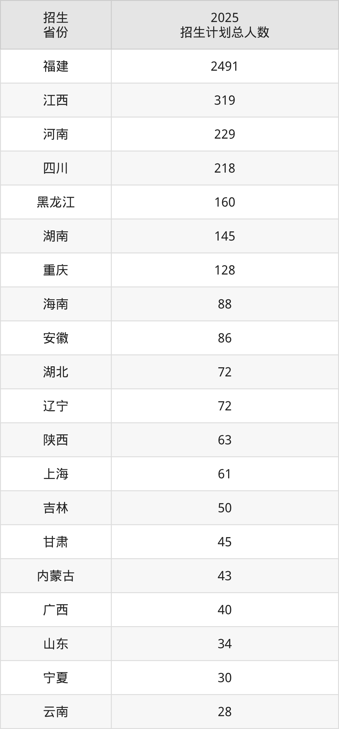 2025年福州外语外贸学院面向全国25个省市开展本科招生;招生专业共34个,招生人数共4498人。2025年在福建省招生计划总人数是2491人,其中,福州外语外贸学院在福建省招生人数最多的是人工智能。福州外语外贸学院在各省具体招生人数情况如下表。