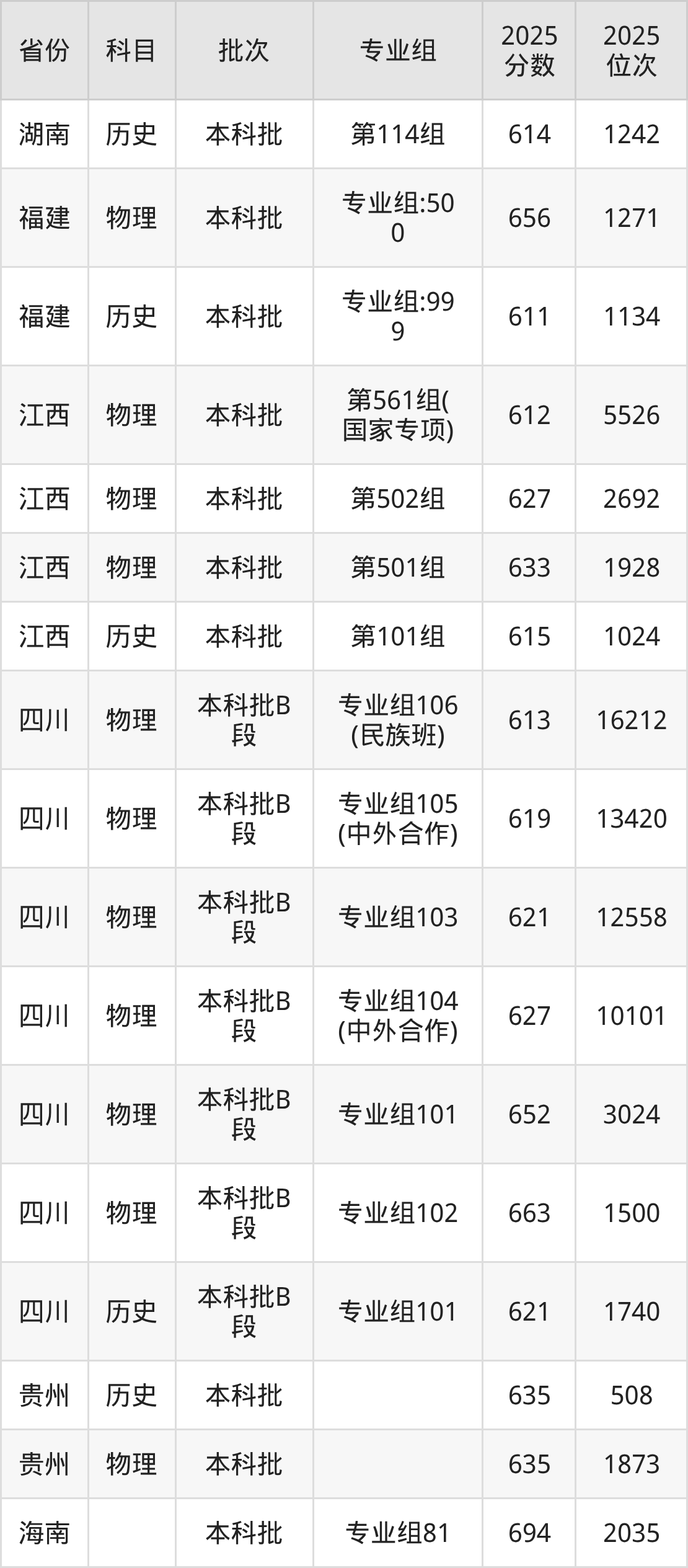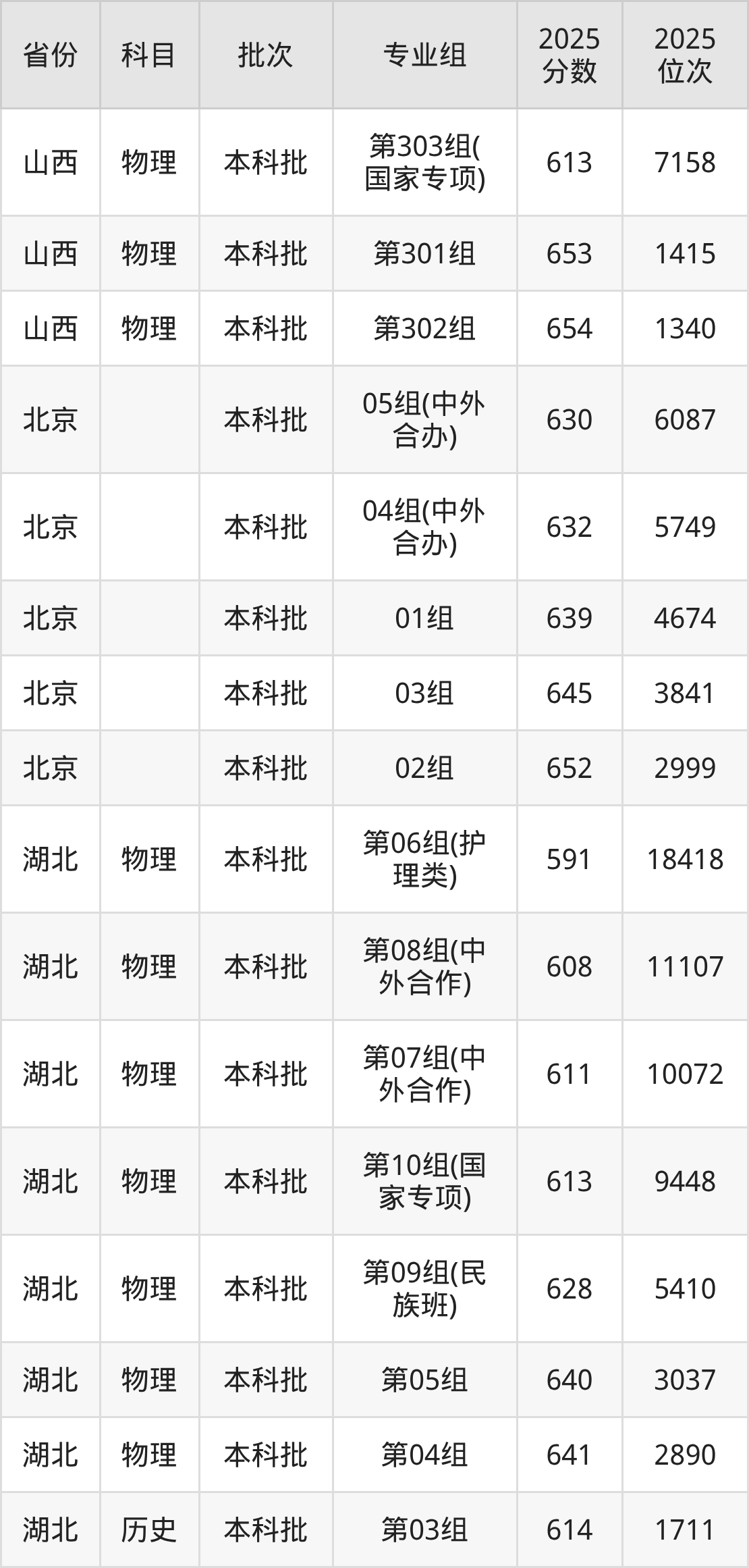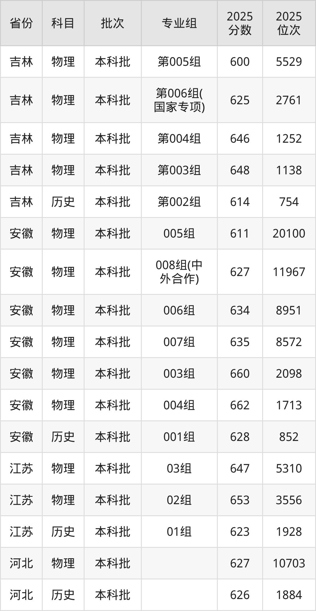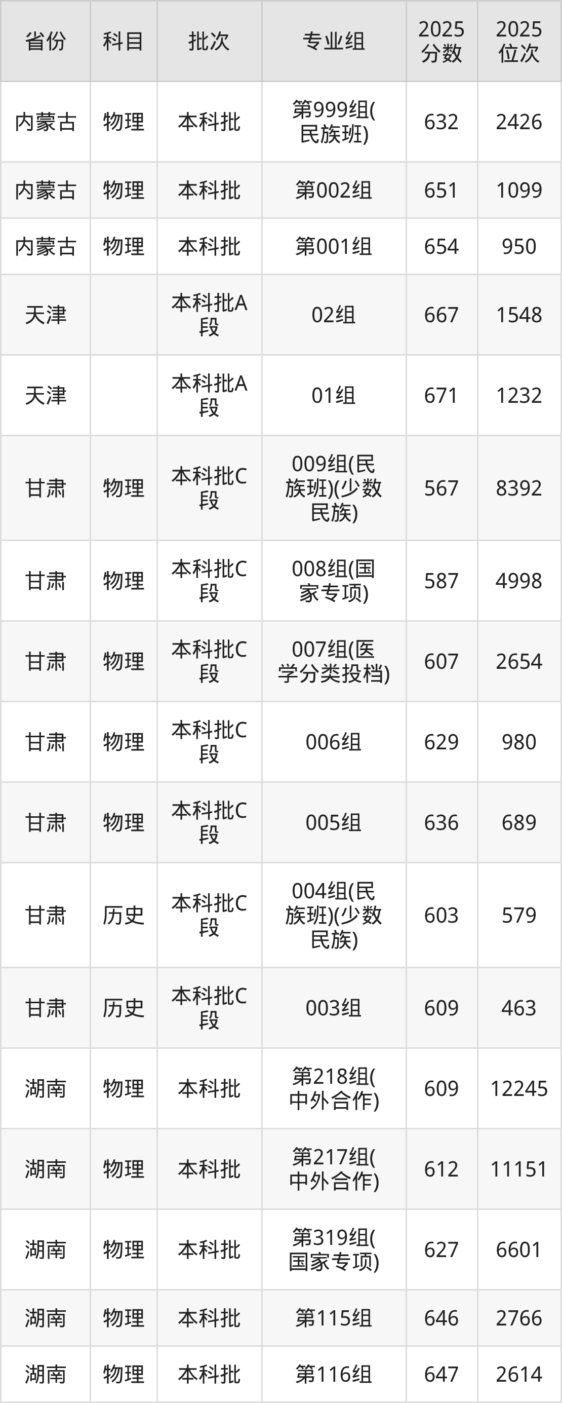 2025年在本科物理类进行招生,各专业组分数线详情如下: