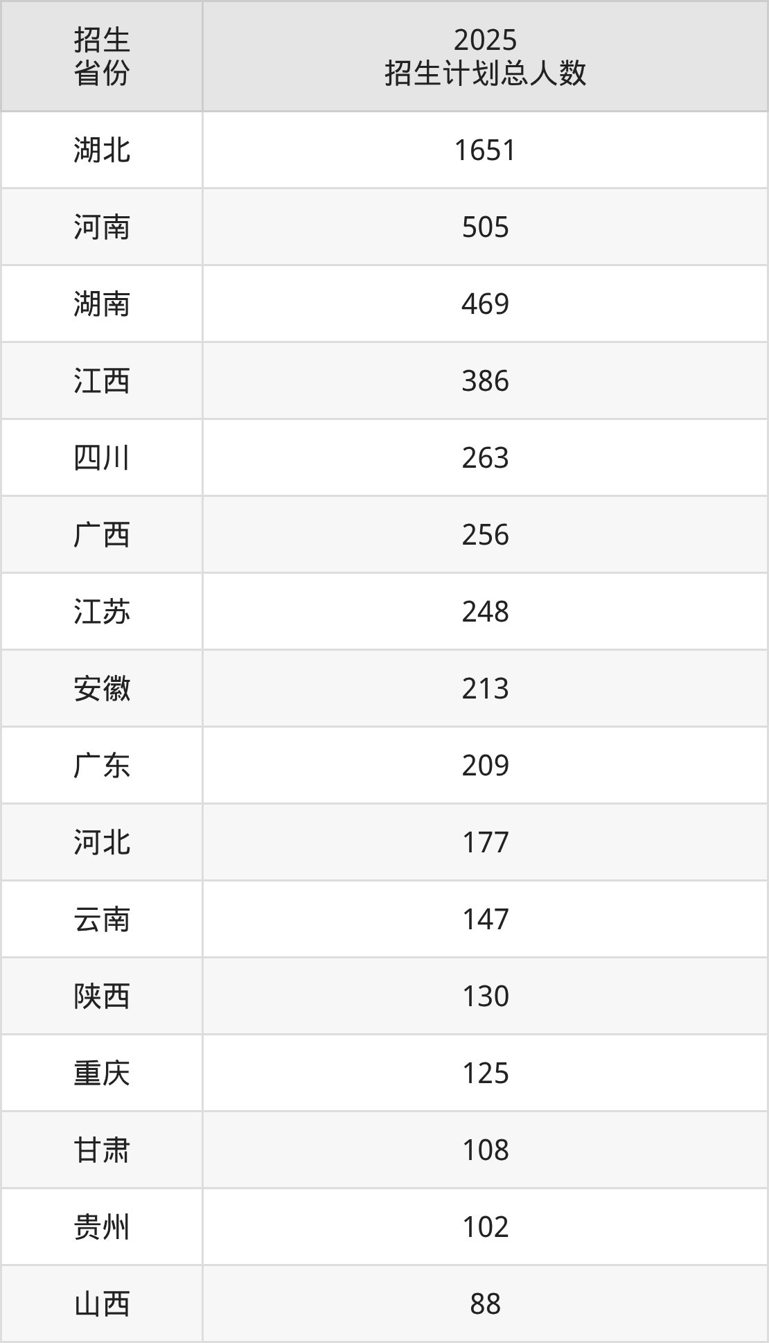 2025年华中科技大学面向全国28个省市开展本科招生;招生专业共67个,招生人数共5788人。2025年在湖北省招生计划总人数是1651人,其中,华中科技大学在湖北省招生人数最多的是电子信息类。华中科技大学在各省具体招生人数情况如下表。