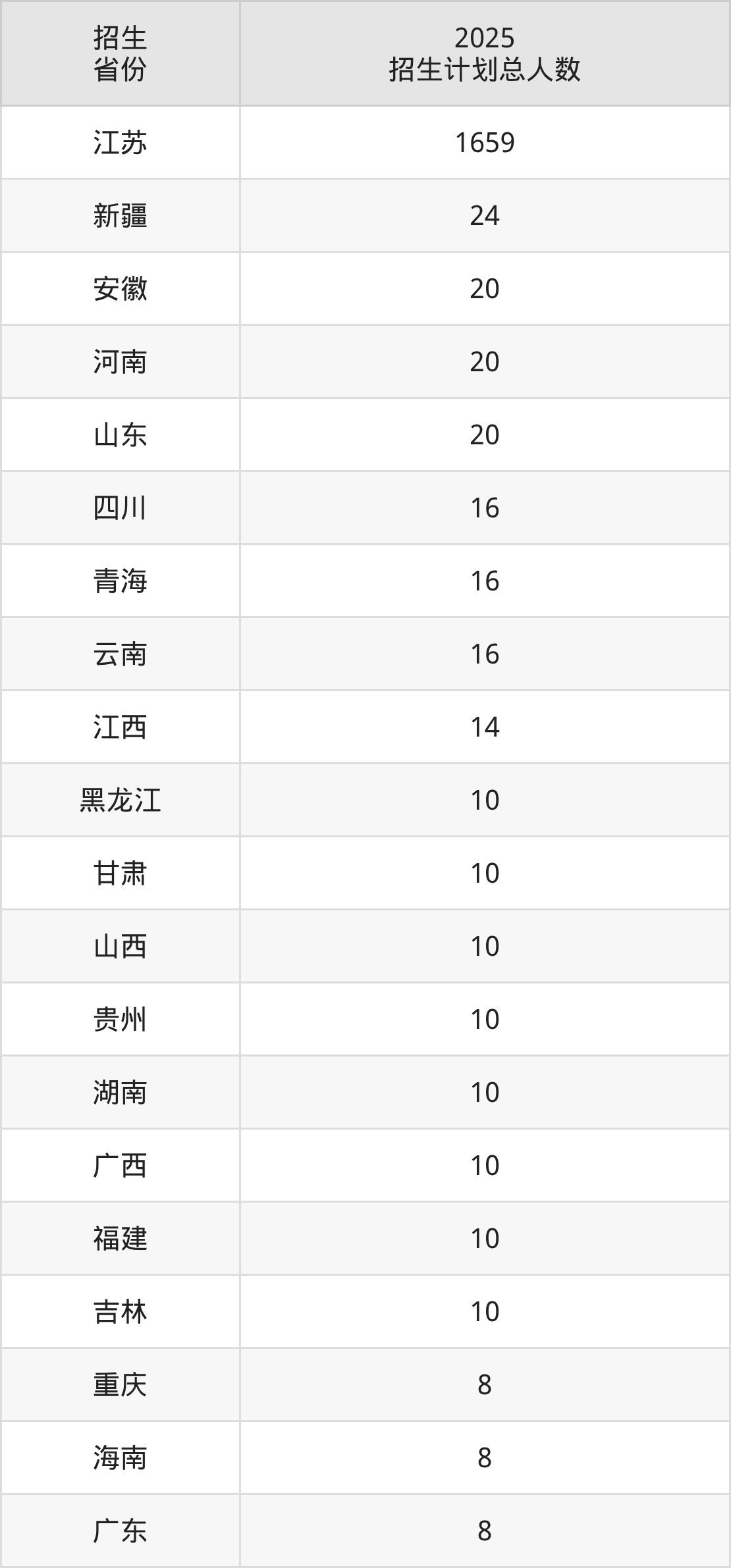 2025年镇江市高等专科学校面向全国22个省市开展专科招生;招生专业共36个,招生人数共1918人。2025年在江苏省招生计划总人数是1659人,其中,镇江市高等专科学校在江苏省招生人数最多的是学前教育。镇江市高等专科学校在各省具体招生人数情况如下表。
