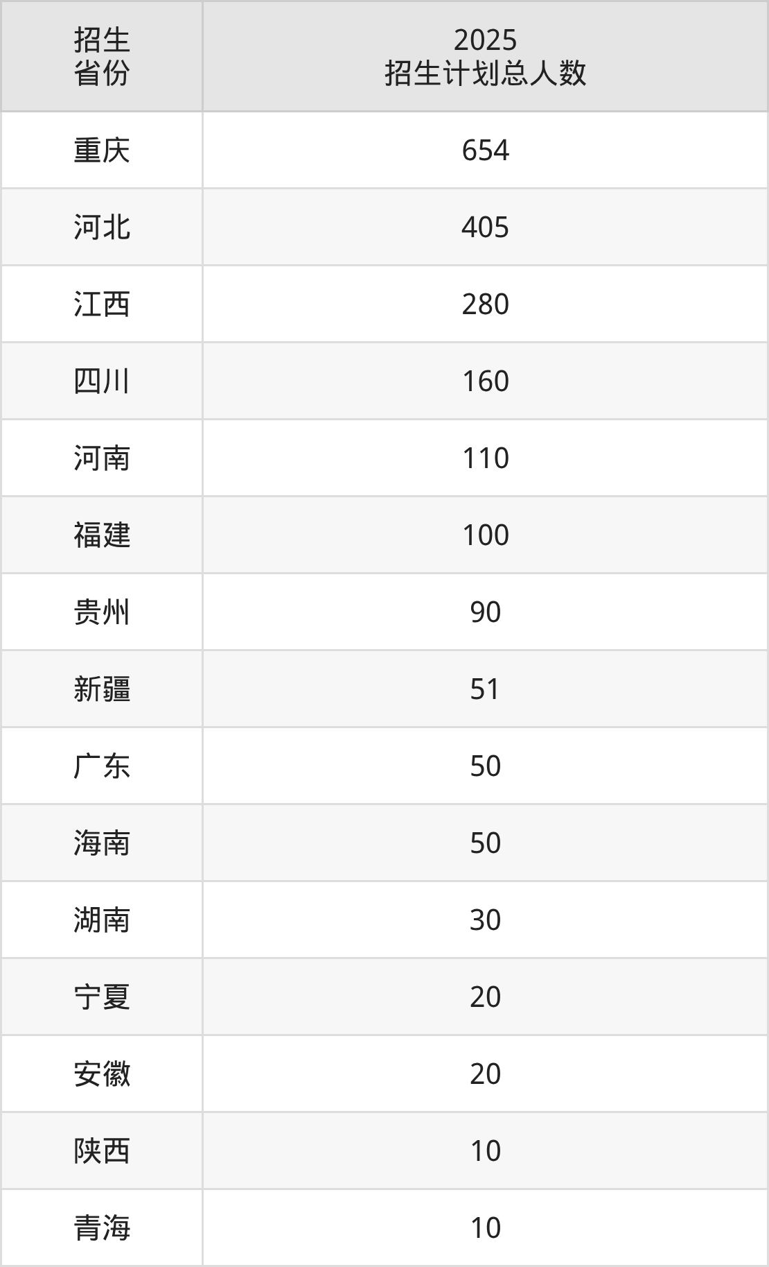 2025年重庆智能工程职业学院面向全国15个省市开展专科招生;招生专业共27个,招生人数共2040人。2025年在重庆市招生计划总人数是654人,其中,重庆智能工程职业学院在重庆市招生人数最多的是人工智能技术应用。重庆智能工程职业学院在各省具体招生人数情况如下表。