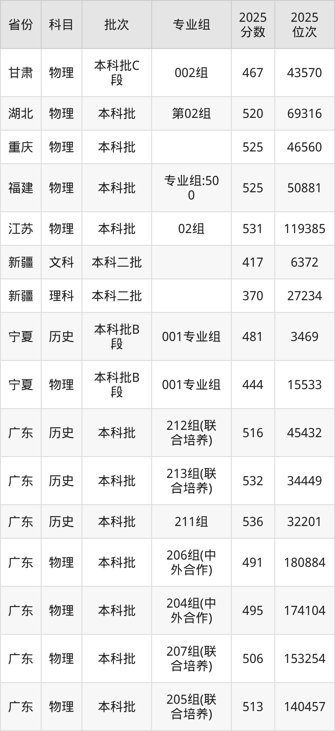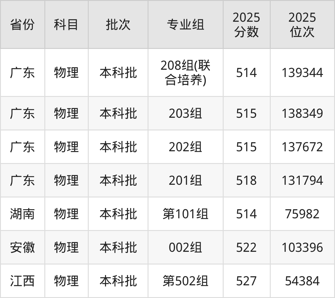 2025年在本科物理类进行招生,各专业组分数线详情如下: