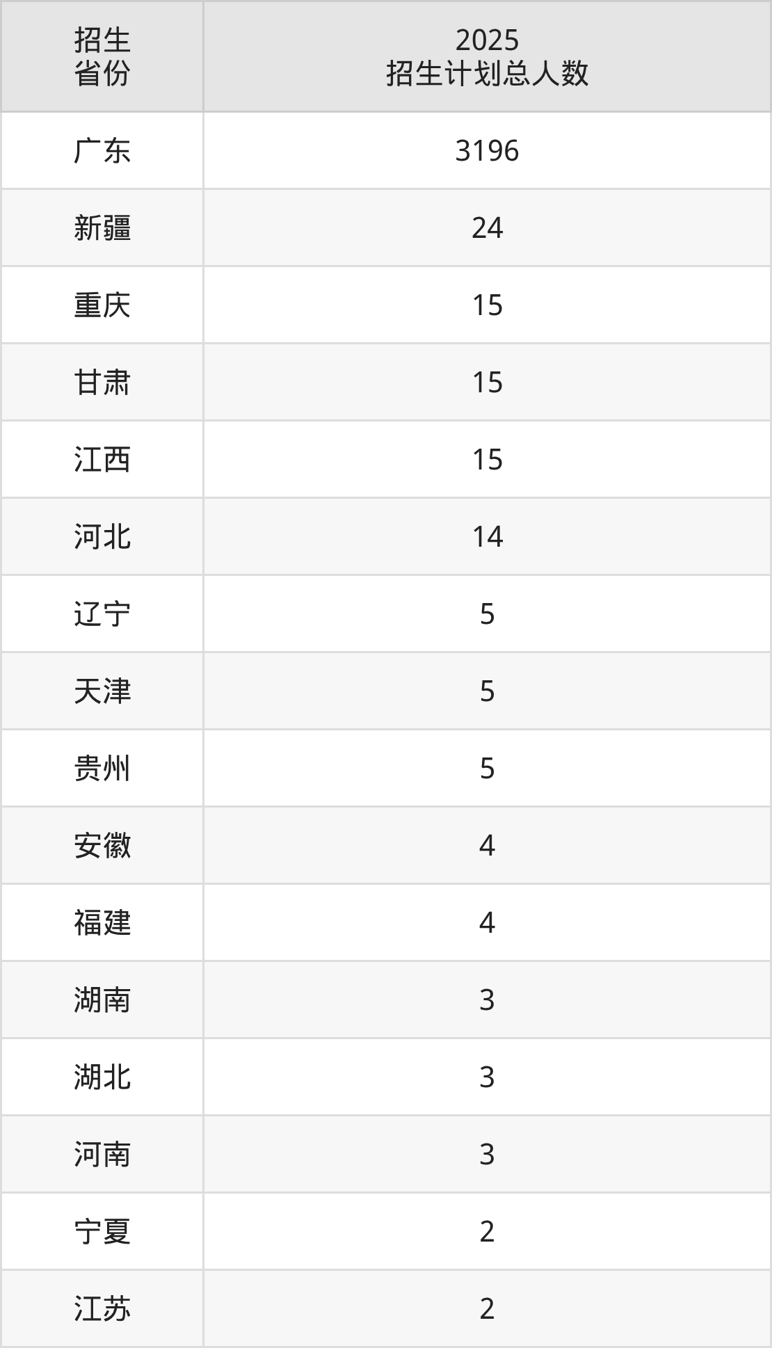 2025年广州航海学院面向全国16个省市开展本科招生;招生专业共33个,招生人数共3315人。2025年在广东省招生计划总人数是3196人,其中,广州航海学院在广东省招生人数最多的是计算机科学与技术。广州航海学院在各省具体招生人数情况如下表。
