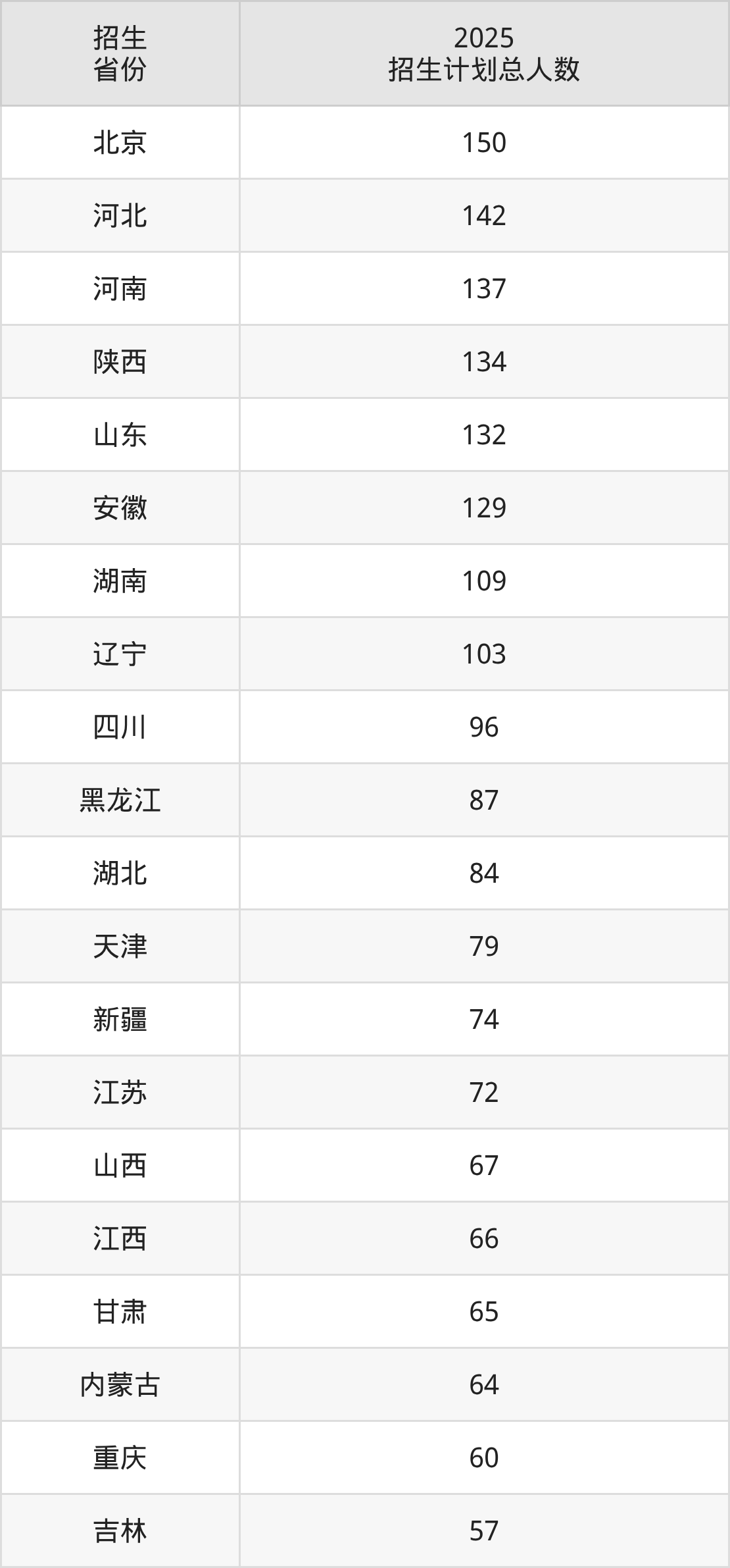 2025年中国石油大学(北京)面向全国29个省市开展本科招生;招生专业共32个,招生人数共2200人。2025年在北京市招生计划总人数是150人,其中,中国石油大学(北京)在北京市招生人数最多的是石油工程。中国石油大学(北京)在各省具体招生人数情况如下表。