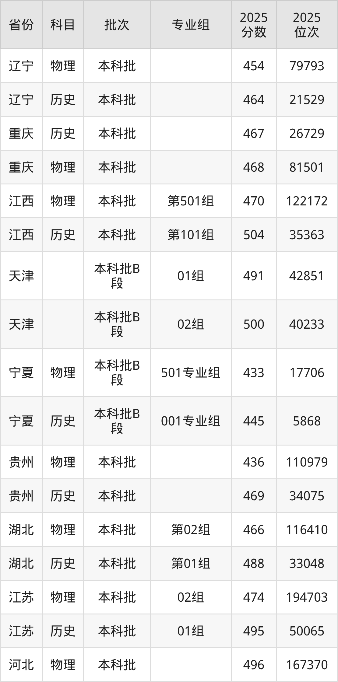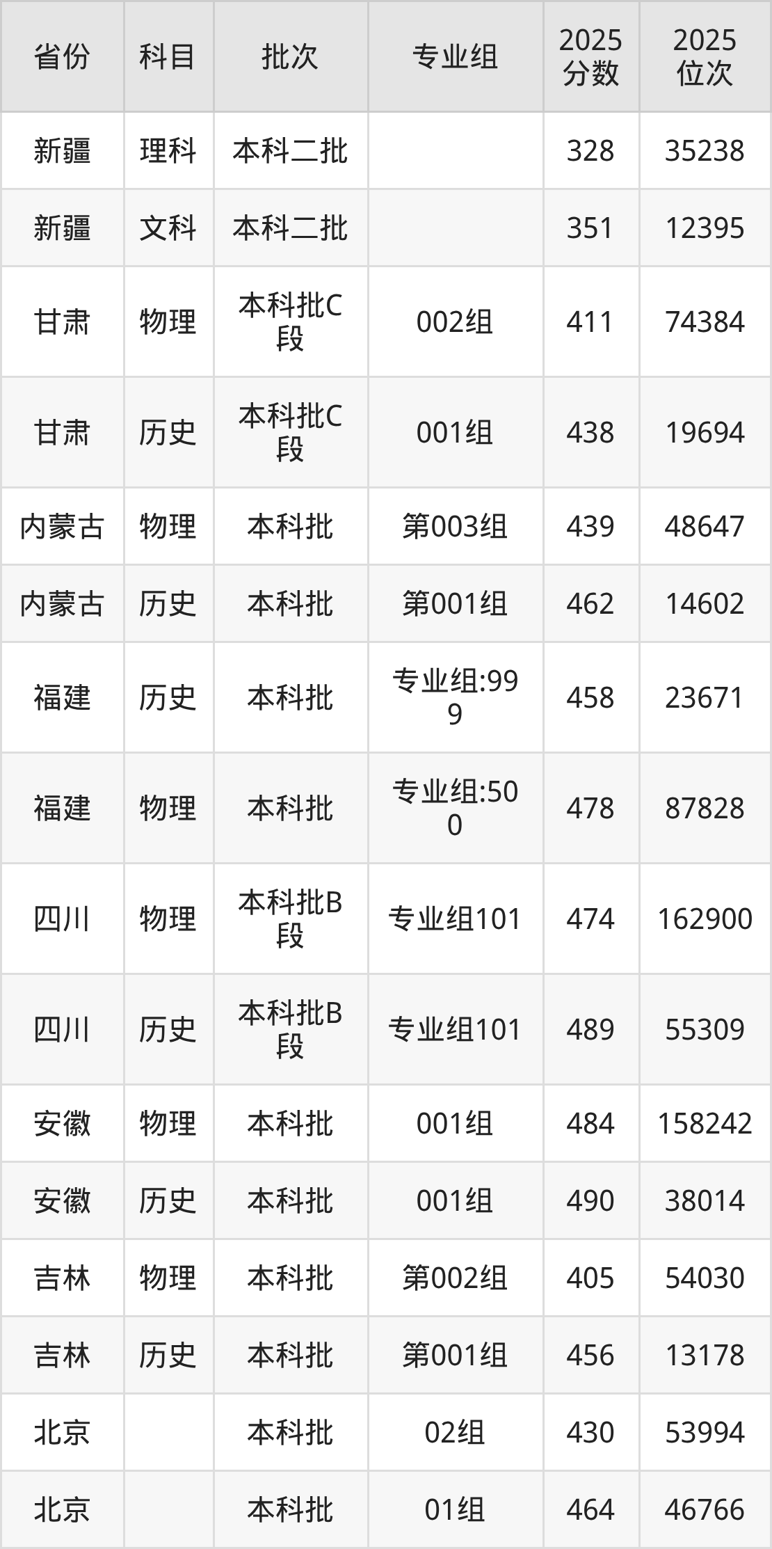 普通类本科物理类最低439分,本科历史类最低462分