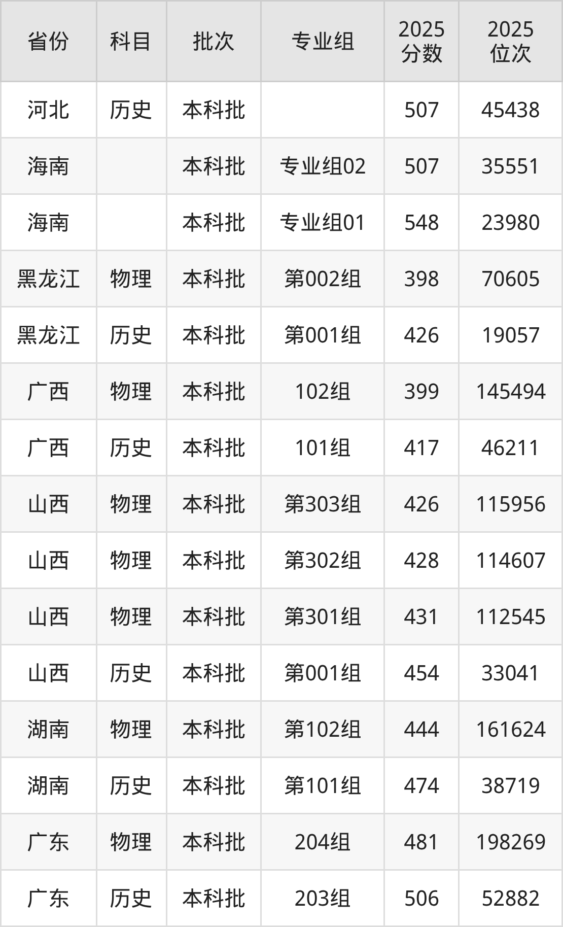 山西晋中理工学院第001组:2025年投档录取最低分为426分,录取最低位次为19057名。