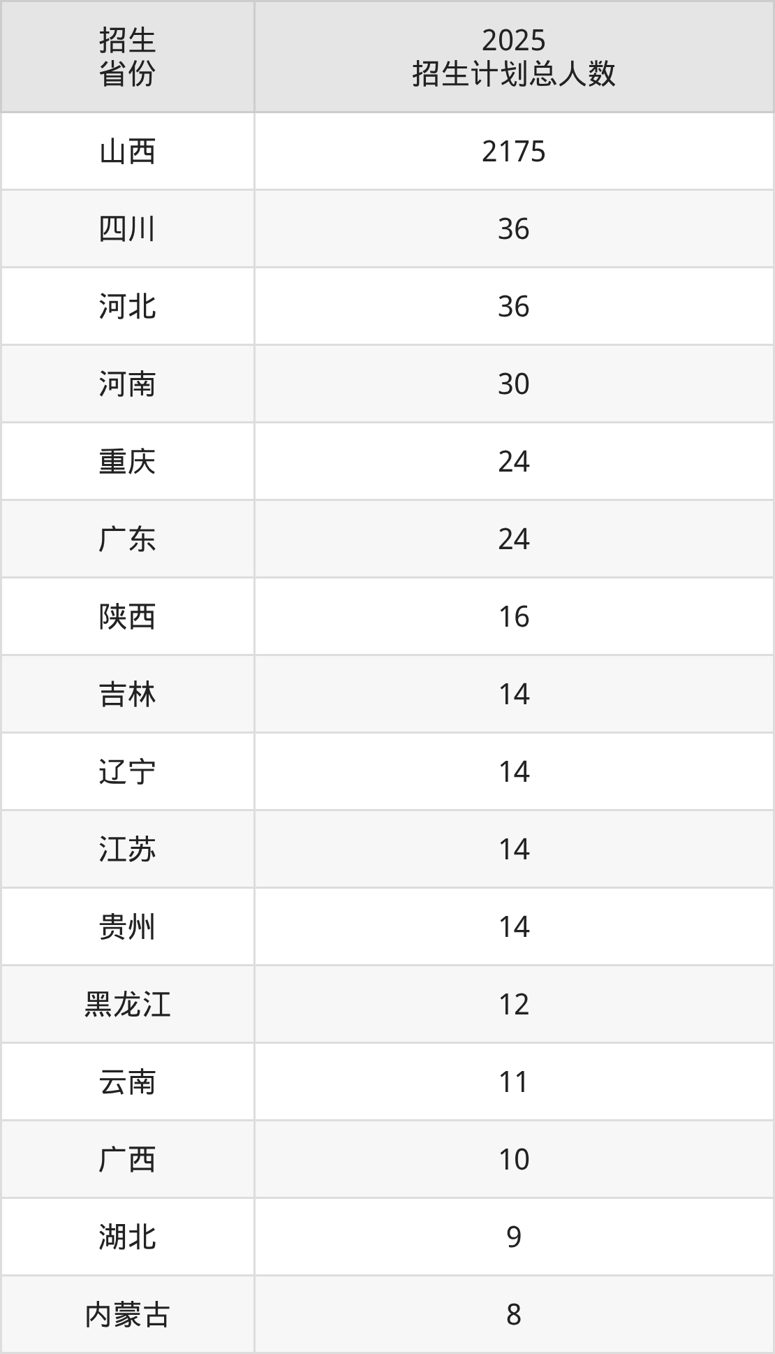 2025年山西晋中理工学院面向全国26个省市开展本科招生;招生专业共27个,招生人数共2492人。2025年在山西省招生计划总人数是2175人,其中,山西晋中理工学院在山西省招生人数最多的是电气工程及其自动化。山西晋中理工学院在各省具体招生人数情况如下表。