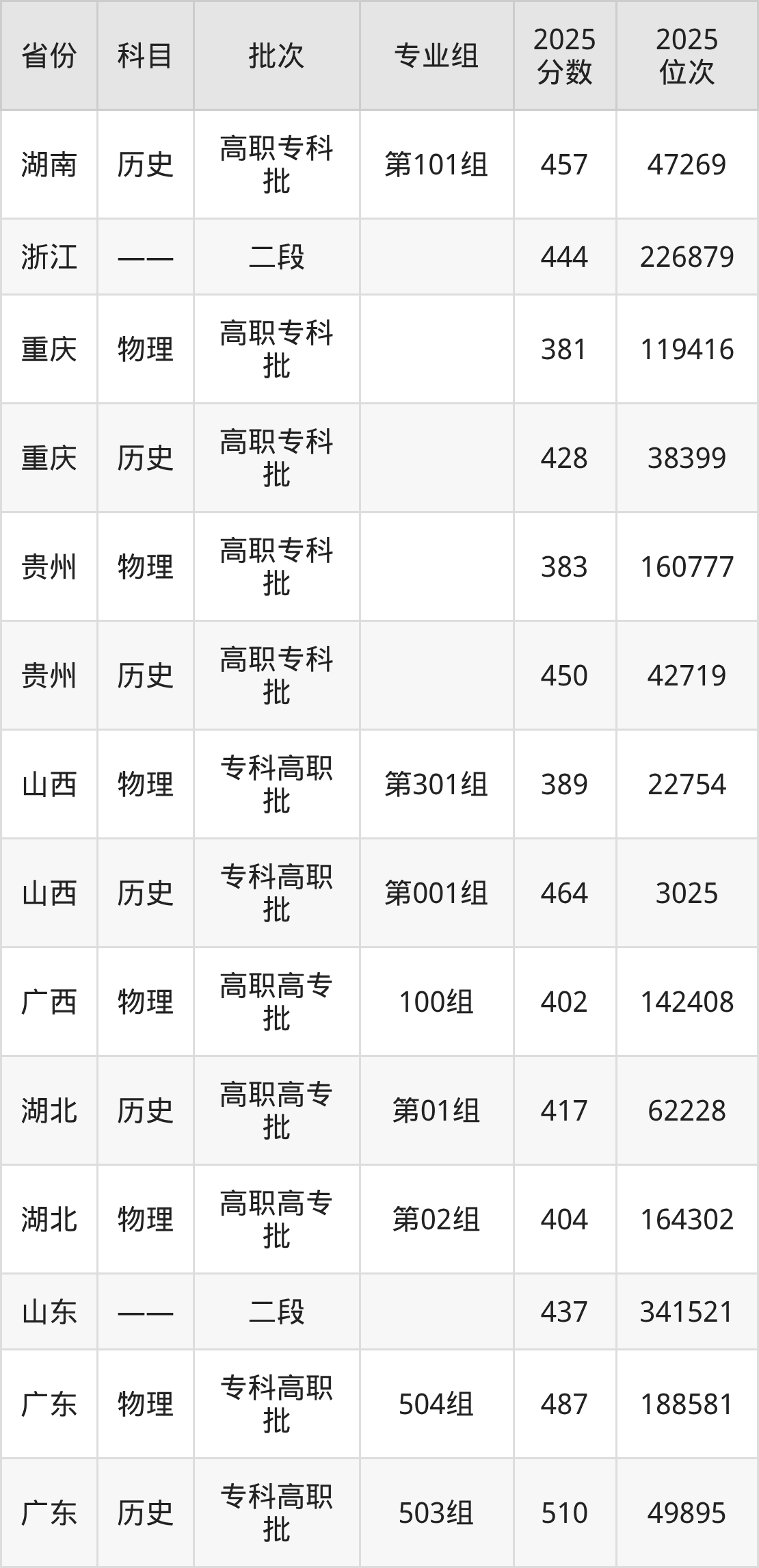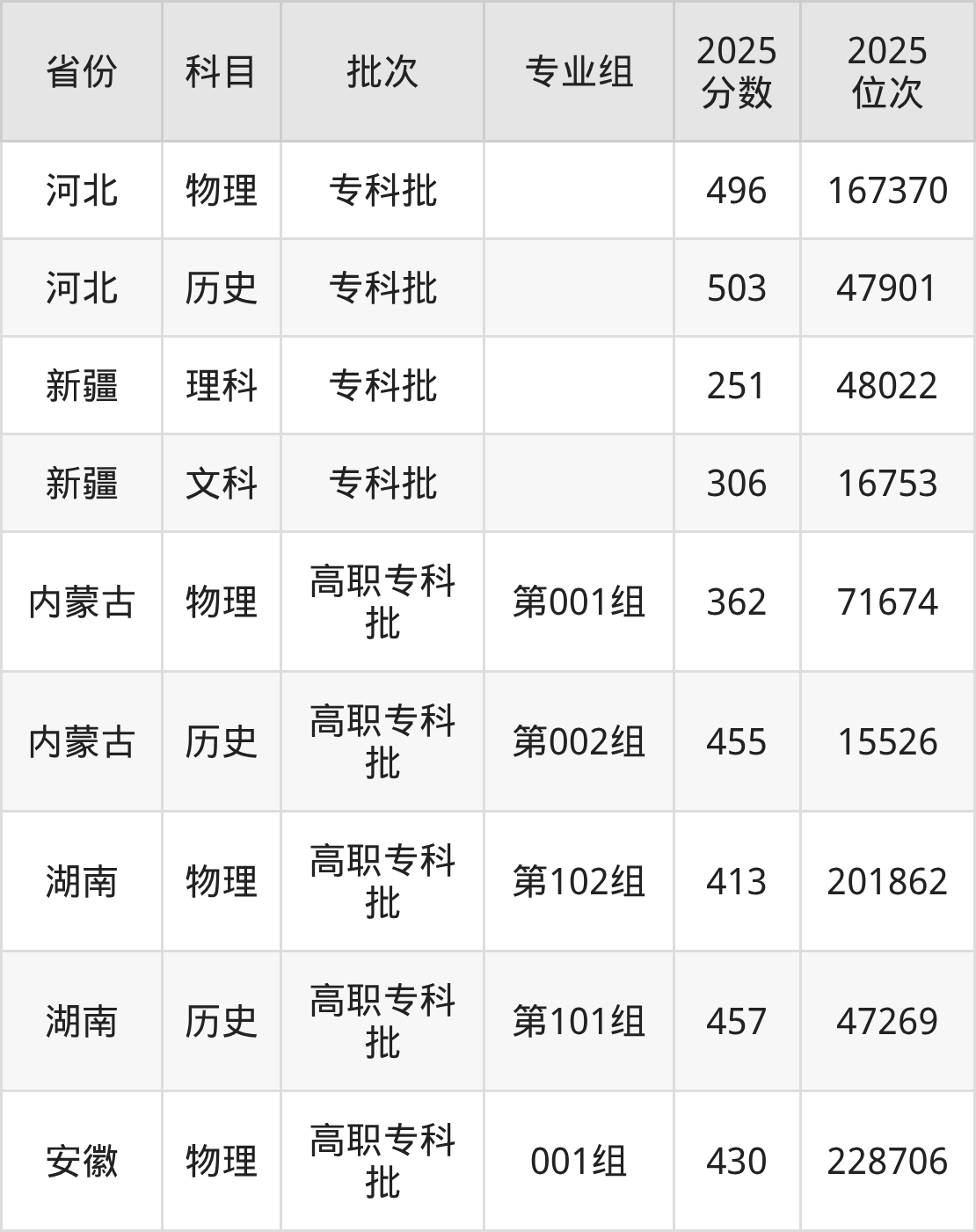 2025年在专科物理类进行招生,各专业组分数线详情如下: