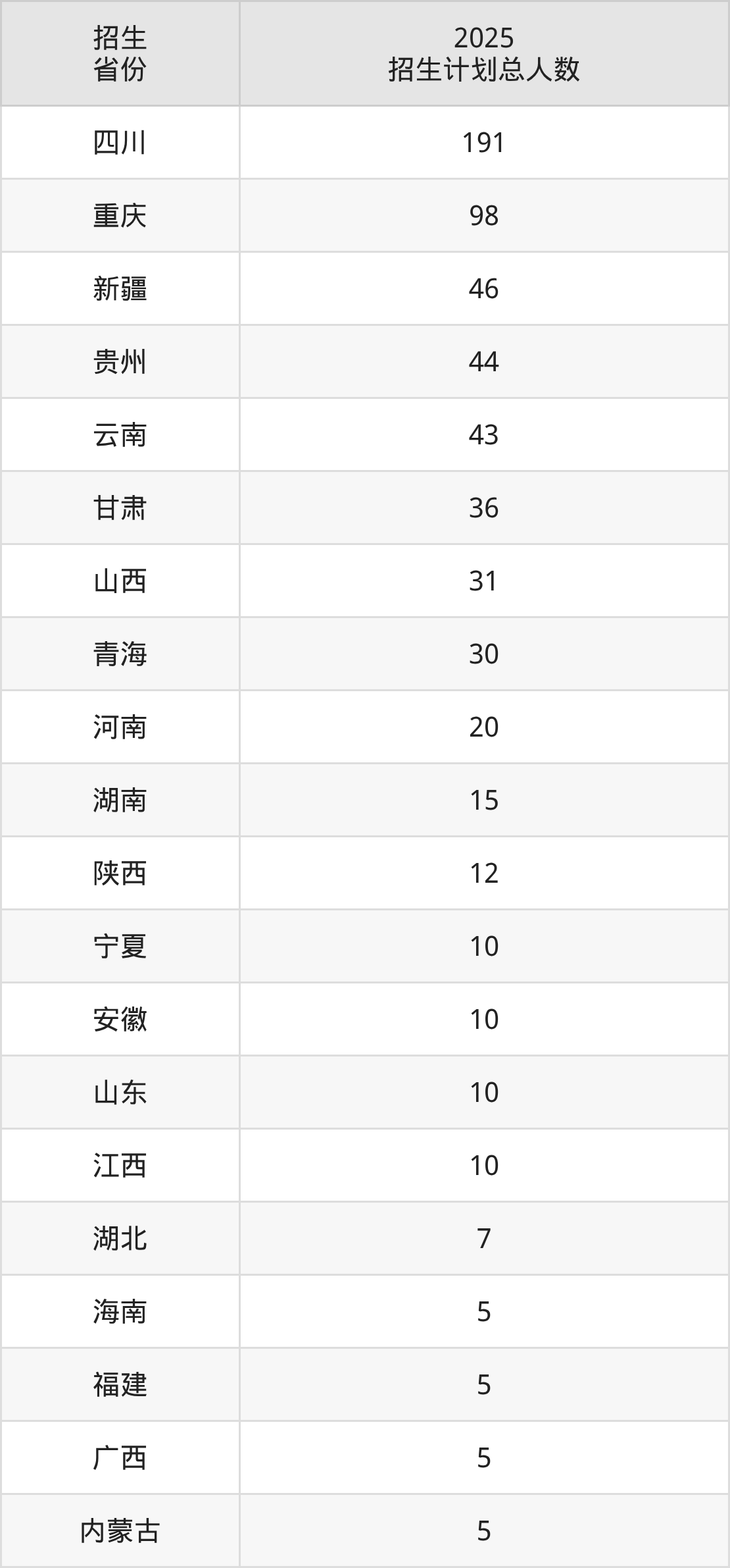 2025年四川交通职业技术学院面向全国23个省市开展专科招生;招生专业共16个,招生人数共641人。2025年在四川省招生计划总人数是191人,其中,四川交通职业技术学院在四川省招生人数最多的是氢能技术应用。四川交通职业技术学院在各省具体招生人数情况如下表。