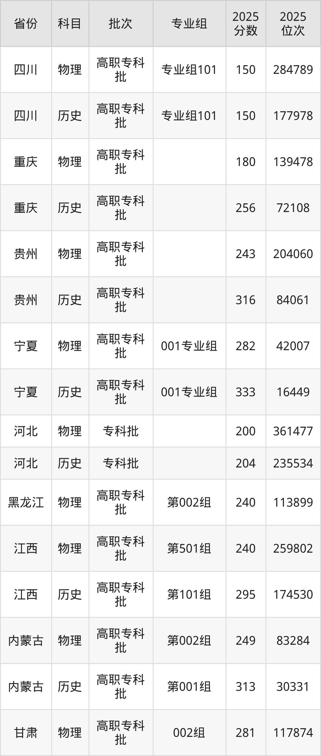 2025年在专科物理类进行招生,各专业组分数线详情如下: