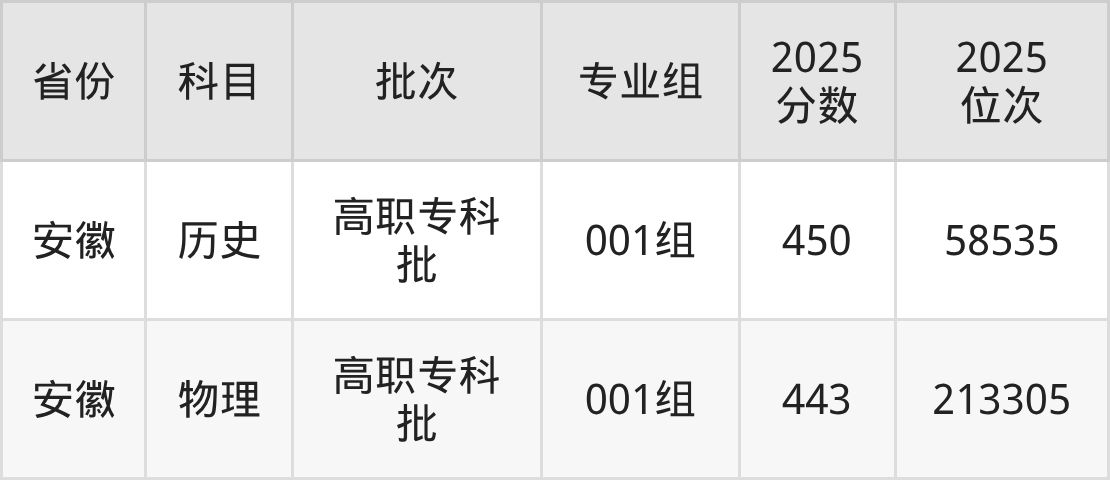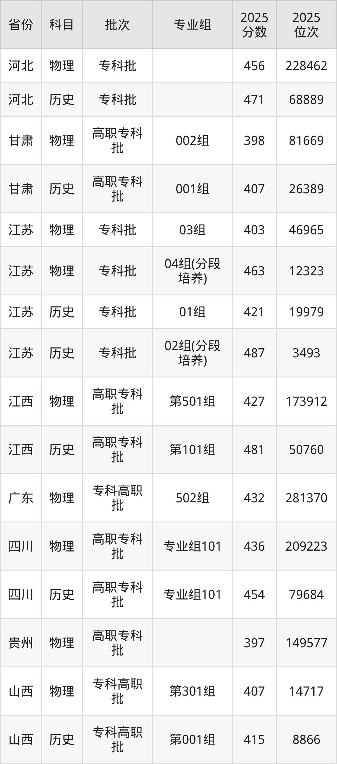 2025年在专科物理类进行招生,各专业组分数线详情如下: