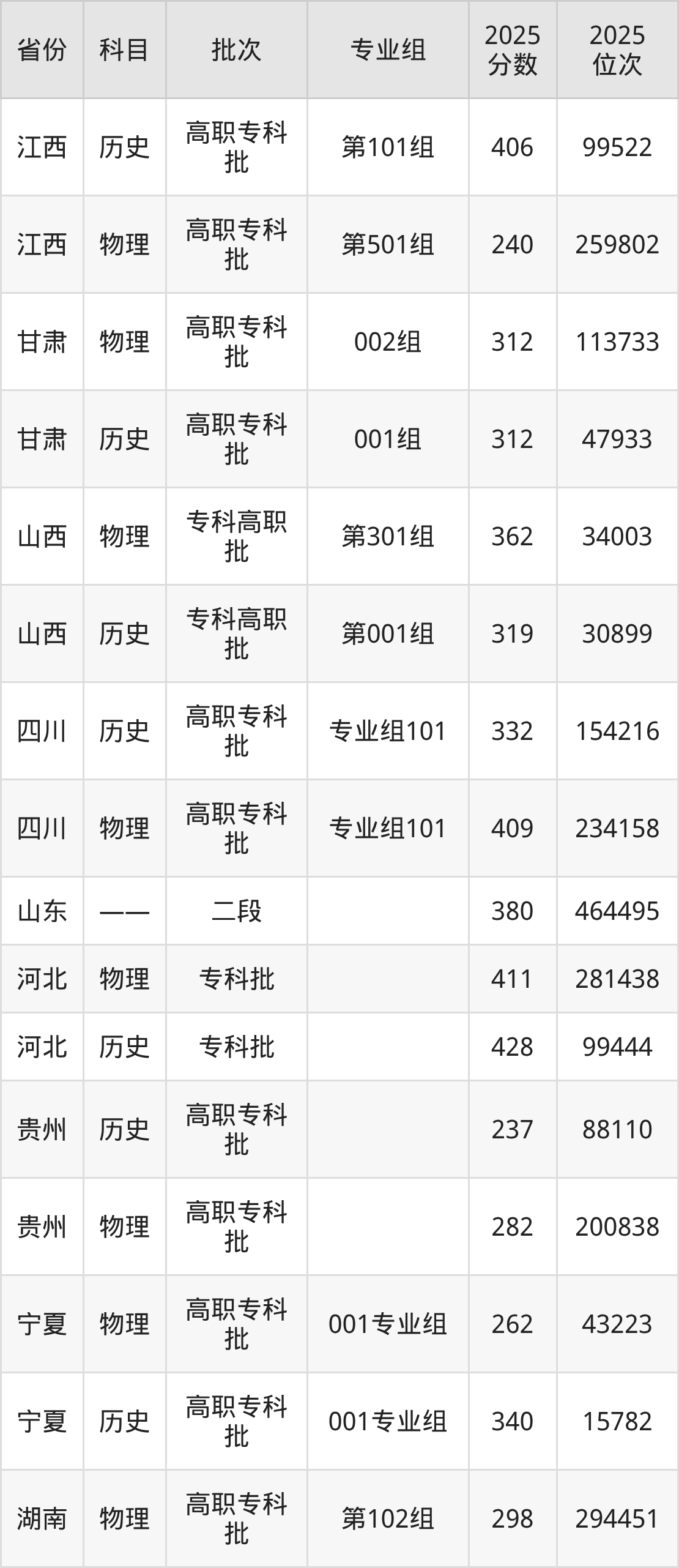 普通类专科物理类最低411分,专科历史类最低428分