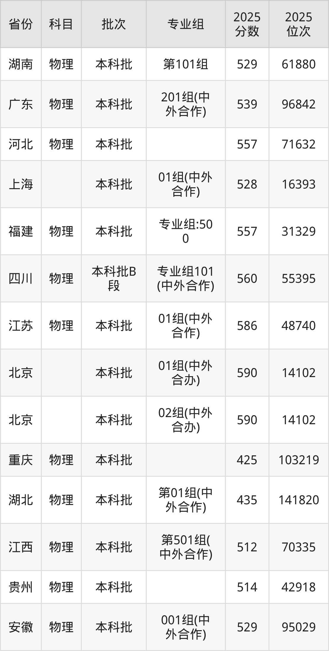 2025年在本科物理类进行招生,各专业组分数线详情如下: