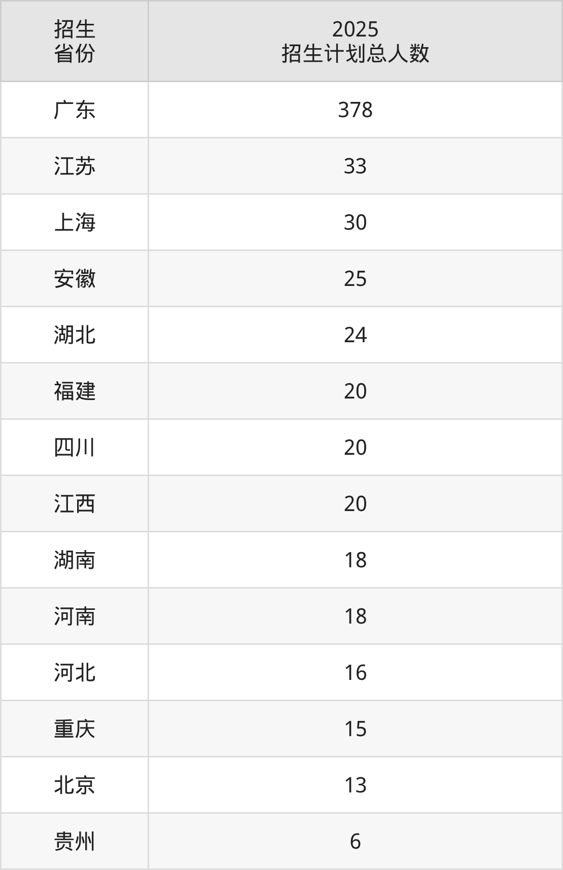 2025年广东以色列理工学院面向全国14个省市开展本科招生;招生专业共6个,招生人数共636人。2025年在广东省招生计划总人数是378人,其中,广东以色列理工学院在广东省招生人数最多的是化学工程与工艺。广东以色列理工学院在各省具体招生人数情况如下表。