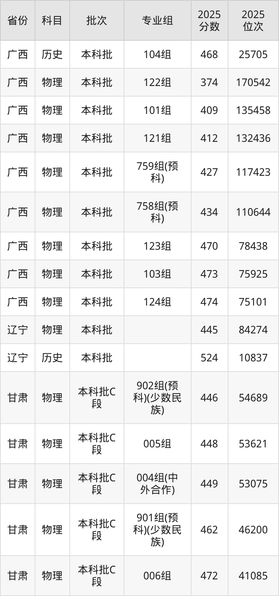 2025年天津城建大学全国录取分数线是374分到592分,录取最低在广西物理类(122组)、录取最高在河北物理类。各省各专业组最低分具有差异,详情如下: