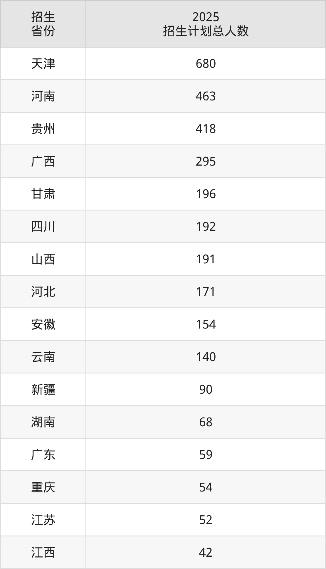 2025年天津城建大学面向全国28个省市开展本科招生;招生专业共46个,招生人数共3605人。2025年在天津市招生计划总人数是680人,其中,天津城建大学在天津市招生人数最多的是计算机类。天津城建大学在各省具体招生人数情况如下表。