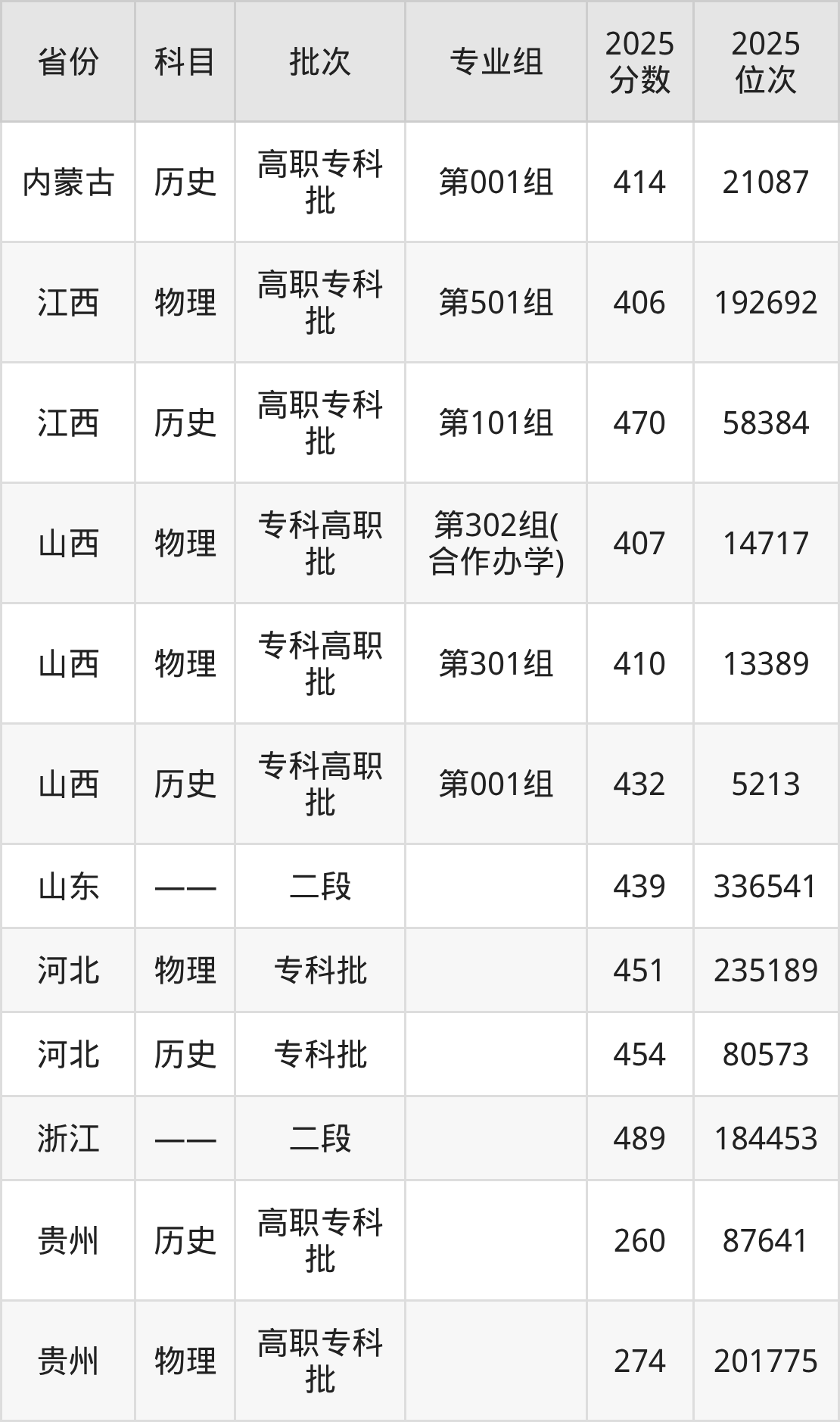 2025年哈尔滨铁道职业技术学院全国录取分数线是260分到489分,录取最低在贵州历史类、录取最高在浙江。各省各专业组最低分具有差异,详情如下:
