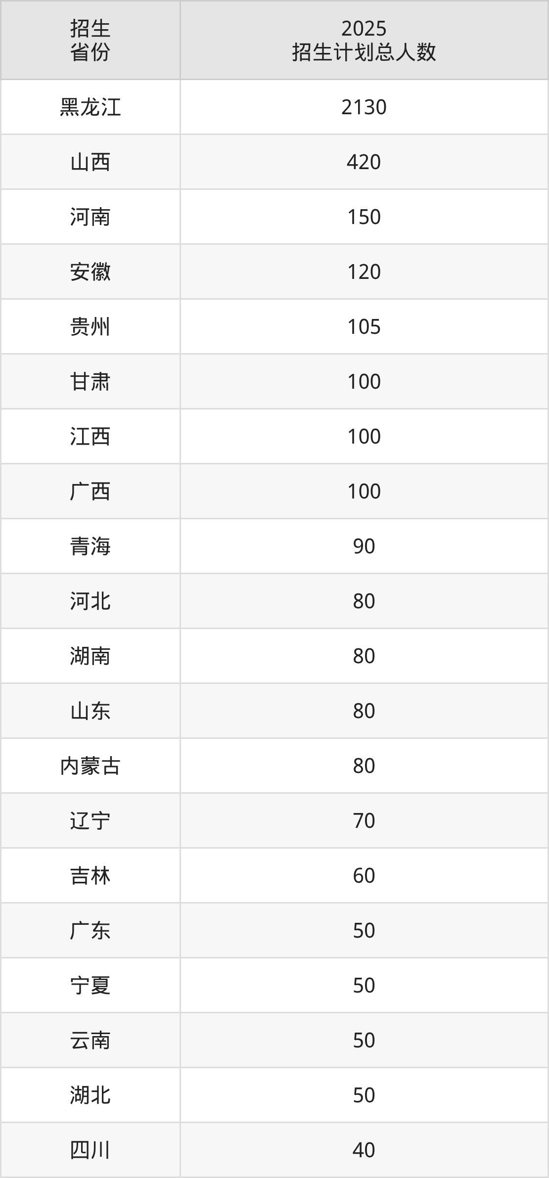 2025年哈尔滨铁道职业技术学院面向全国27个省市开展专科招生;招生专业共24个,招生人数共4154人。2025年在黑龙江省招生计划总人数是2130人,其中,哈尔滨铁道职业技术学院在黑龙江省招生人数最多的是城市轨道交通工程技术。哈尔滨铁道职业技术学院在各省具体招生人数情况如下表。