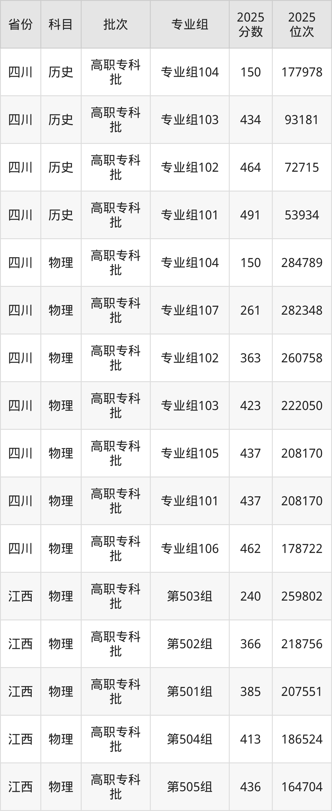 普通类专科历史类最低441分,专科物理类最低240分
