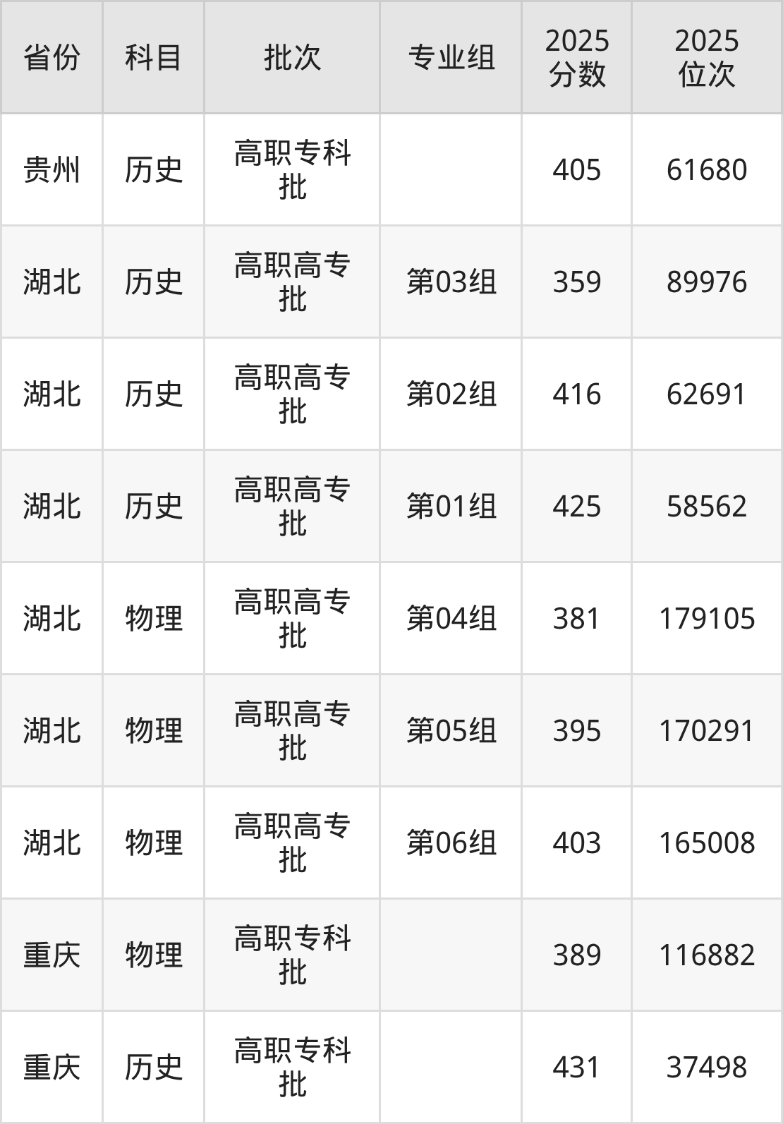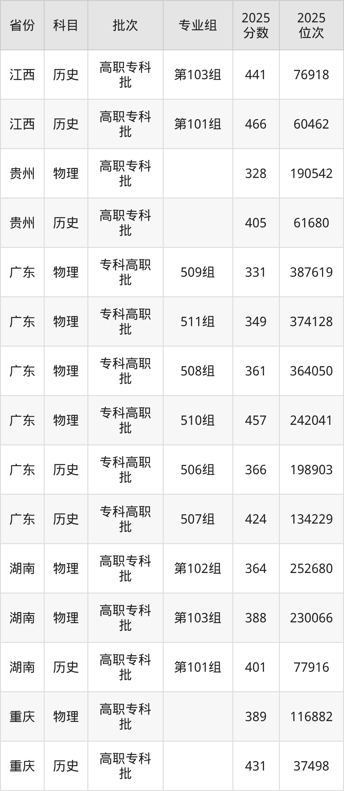普通类专科物理类最低389分,专科历史类最低431分