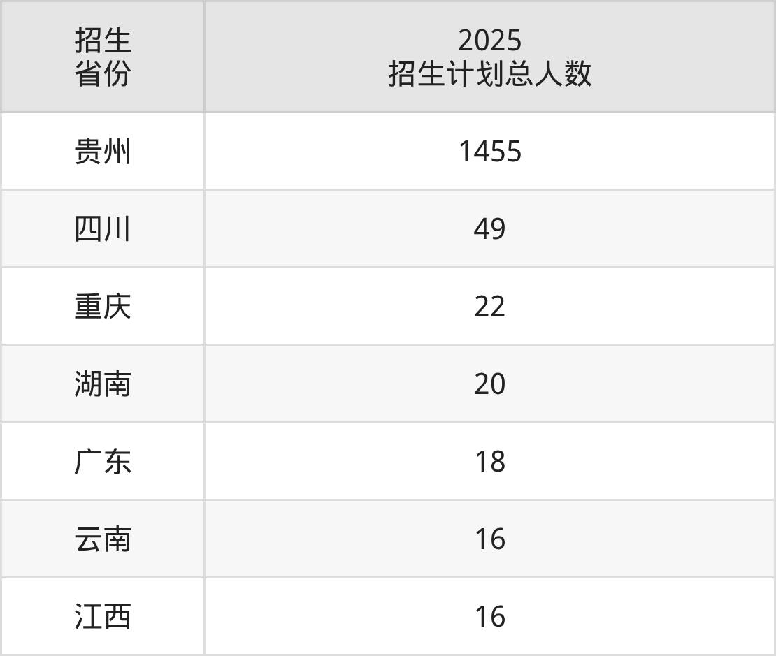2025年毕节医学高等专科学校面向全国7个省市开展专科招生;招生专业共18个,招生人数共1596人。2025年在贵州省招生计划总人数是1455人,其中,毕节医学高等专科学校在贵州省招生人数最多的是临床医学。毕节医学高等专科学校在各省具体招生人数情况如下表。