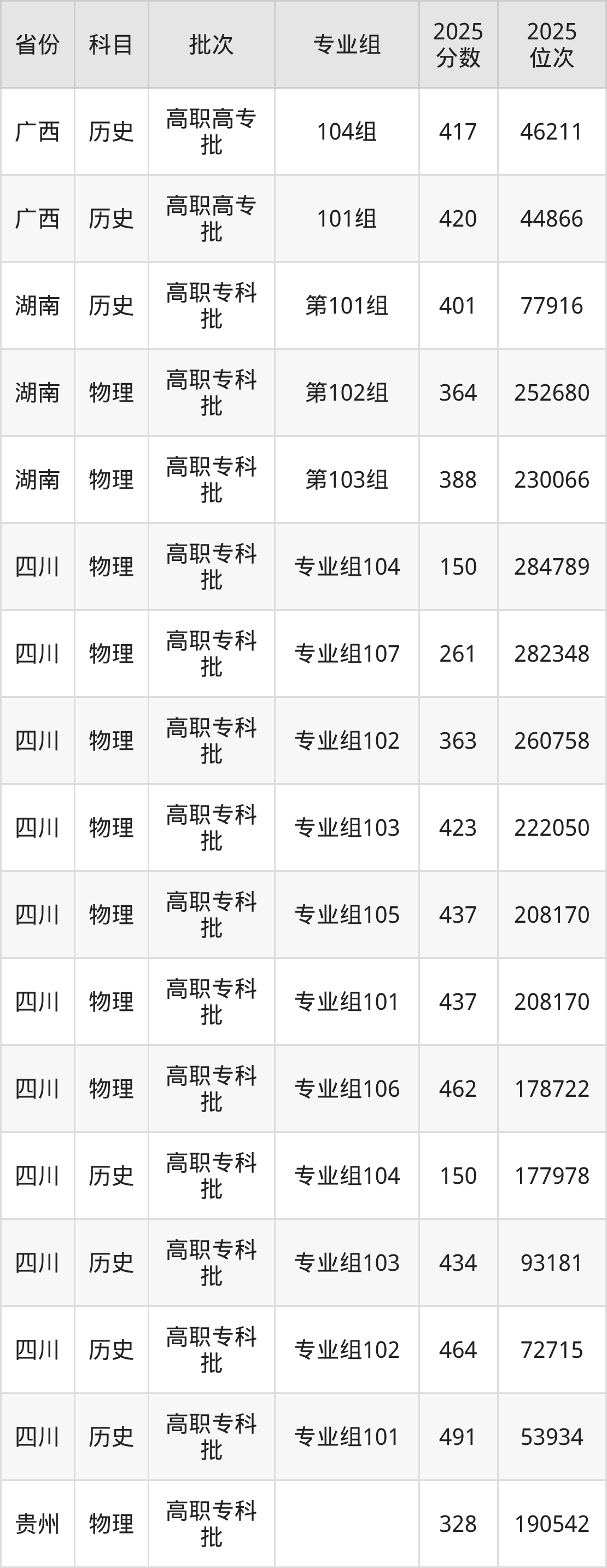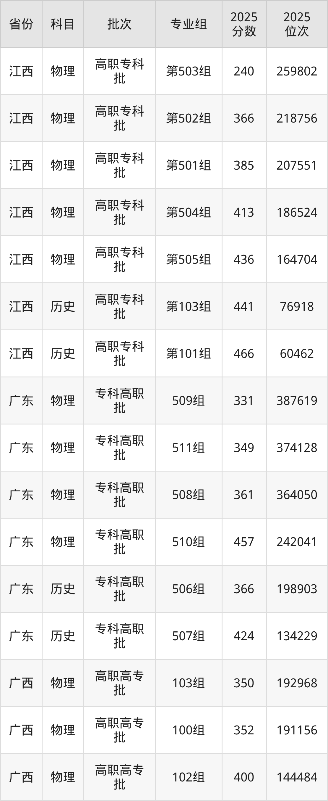 普通类专科物理类最低364分,专科历史类最低401分