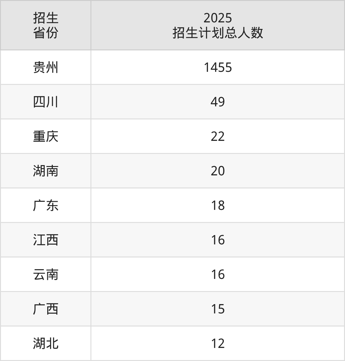 2025年毕节医学高等专科学校面向全国9个省市开展专科招生;招生专业共18个,招生人数共1623人。2025年在贵州省招生计划总人数是1455人,其中,毕节医学高等专科学校在贵州省招生人数最多的是临床医学。毕节医学高等专科学校在各省具体招生人数情况如下表。