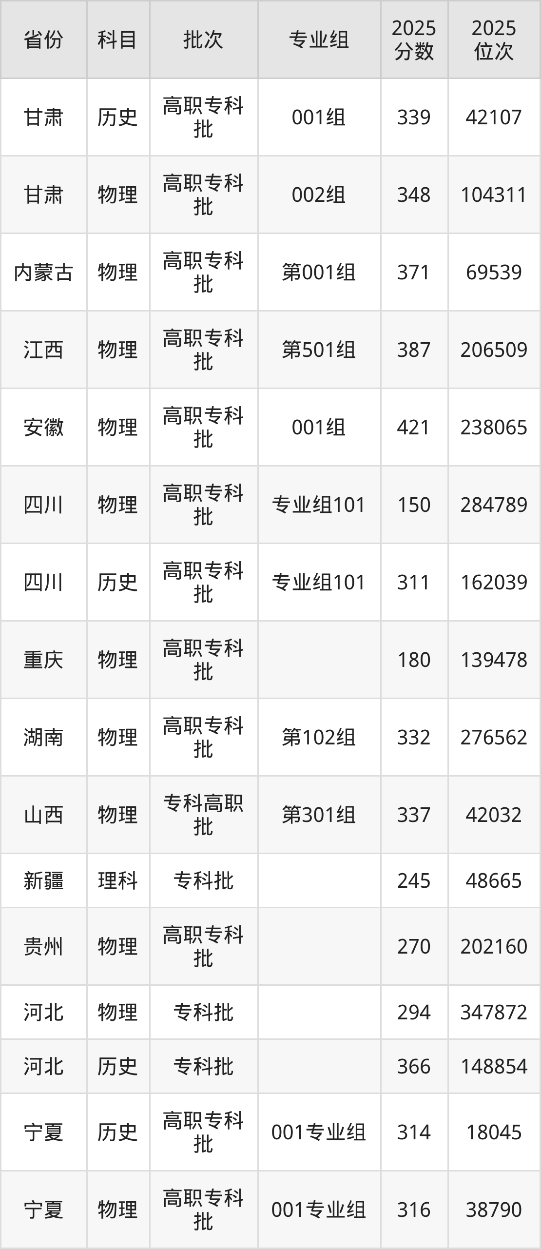 2025年在专科物理类进行招生,各专业组分数线详情如下: