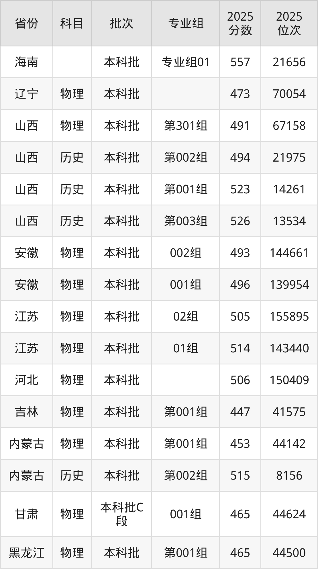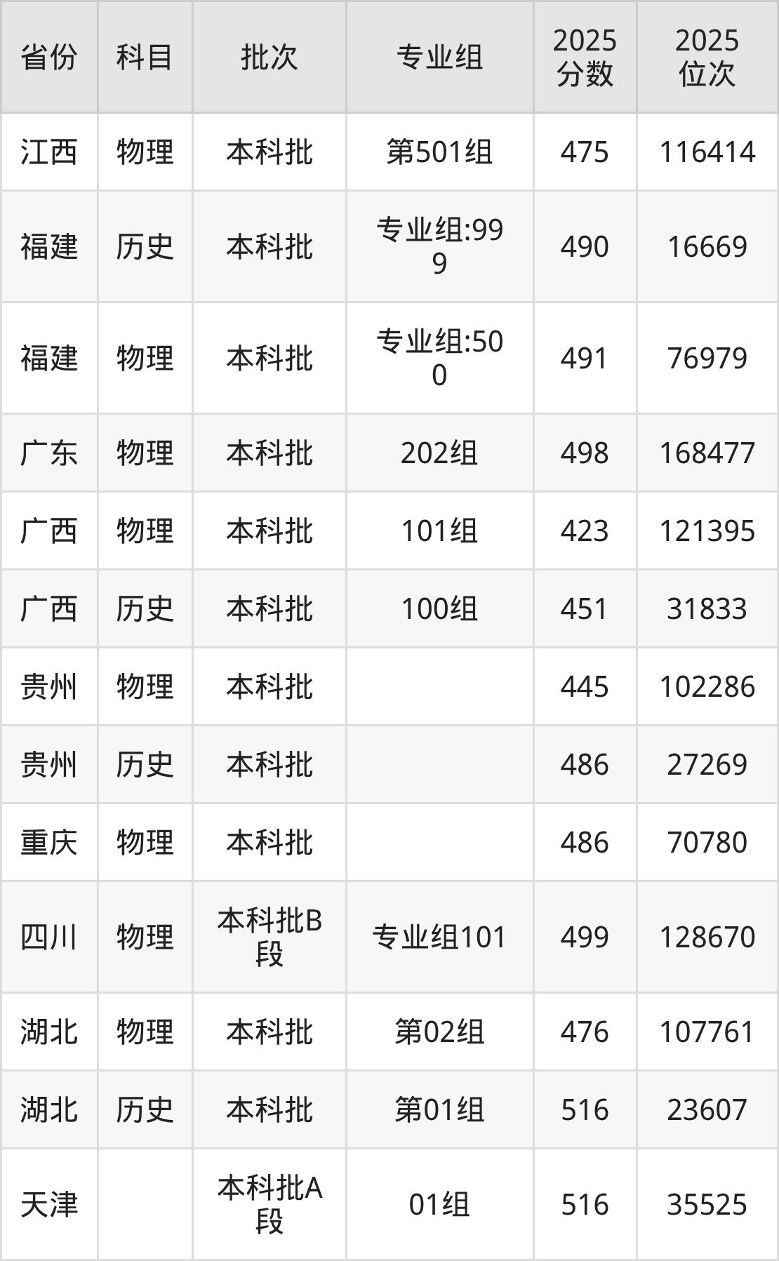 2025年在本科物理类进行招生,各专业组分数线详情如下:
