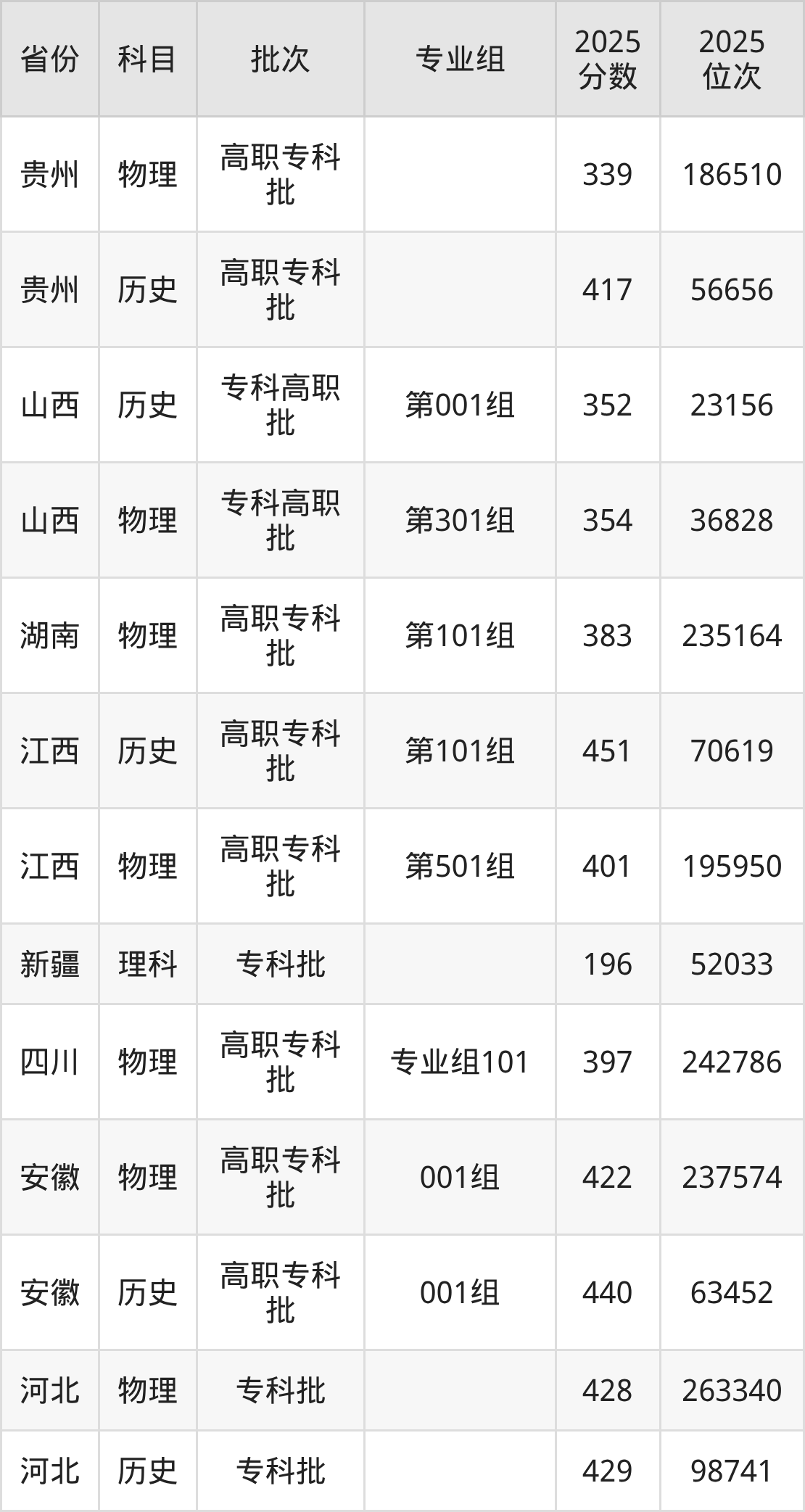 2025年在专科物理类进行招生,各专业组分数线详情如下: