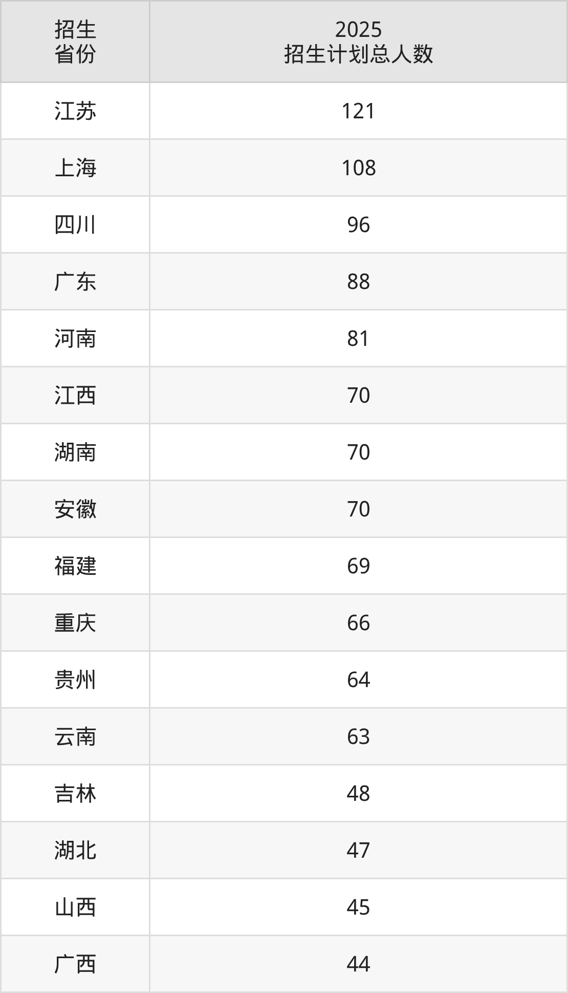 2025年复旦大学面向全国28个省市开展本科招生;招生专业共32个,招生人数共1434人。2025年在上海市招生计划总人数是108人,其中,复旦大学在上海市招生人数最多的是核工程与核技术。复旦大学在各省具体招生人数情况如下表。