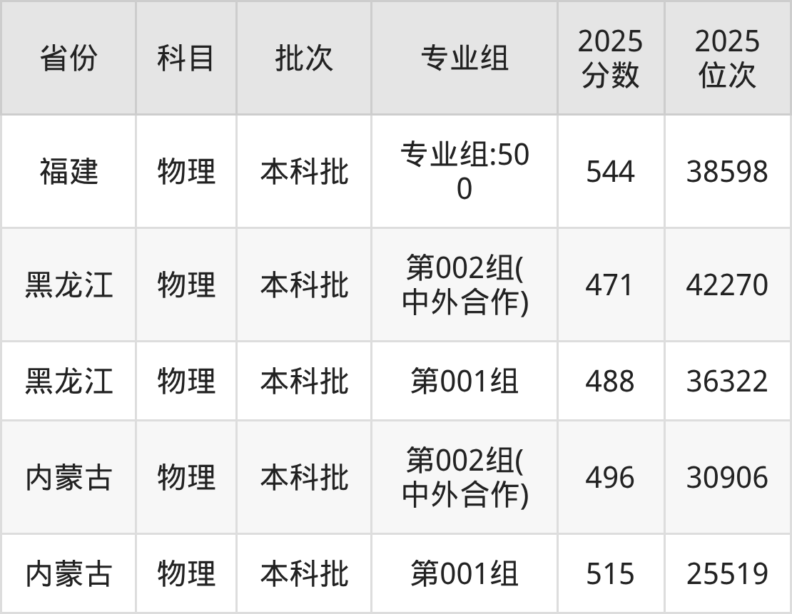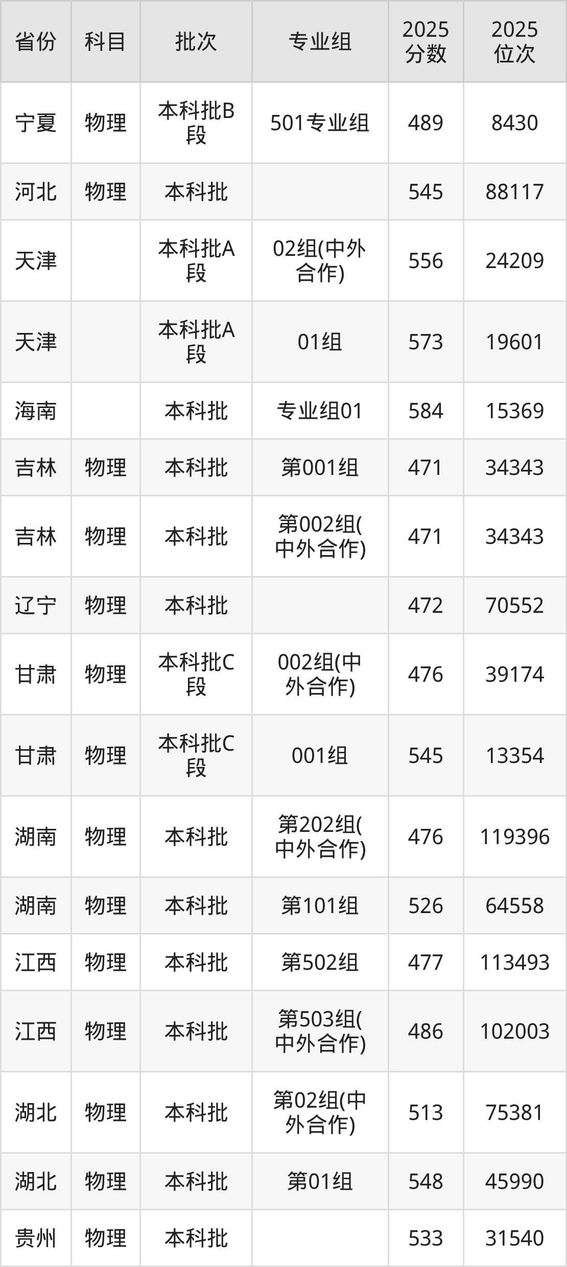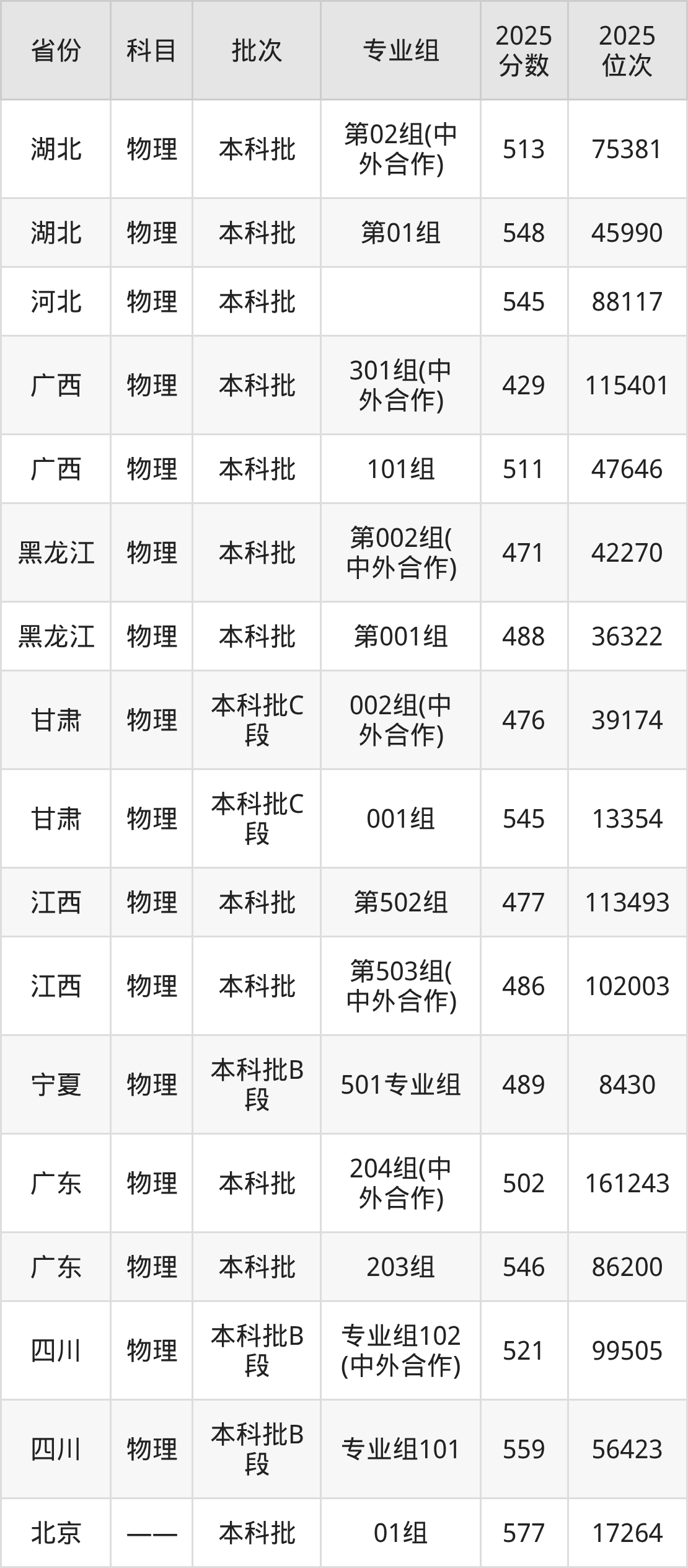 2025年在本科物理类进行招生,各专业组分数线详情如下: