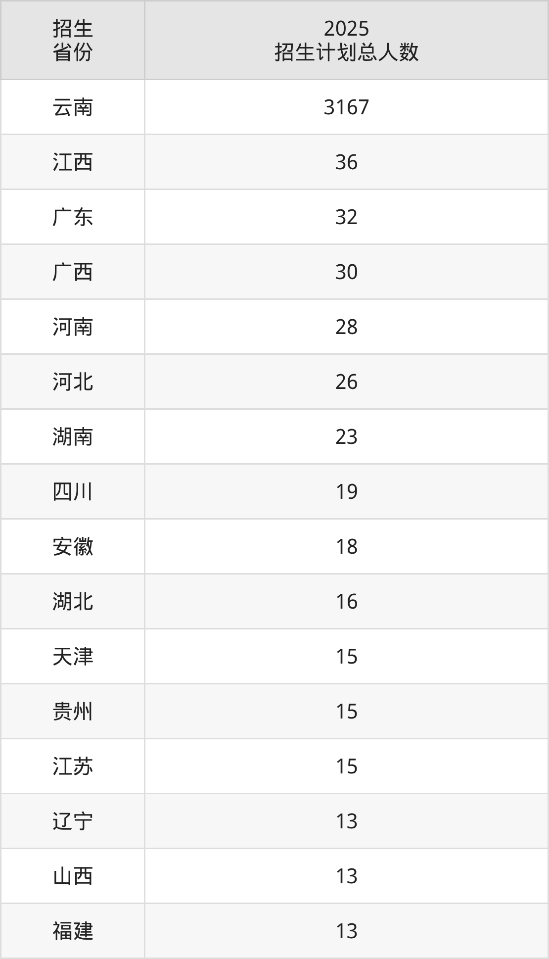 2025年昆明医科大学面向全国28个省市开展本科招生;招生专业共31个,招生人数共3589人。2025年在云南省招生计划总人数是3167人,其中,昆明医科大学在云南省招生人数最多的是临床医学。昆明医科大学在各省具体招生人数情况如下表。