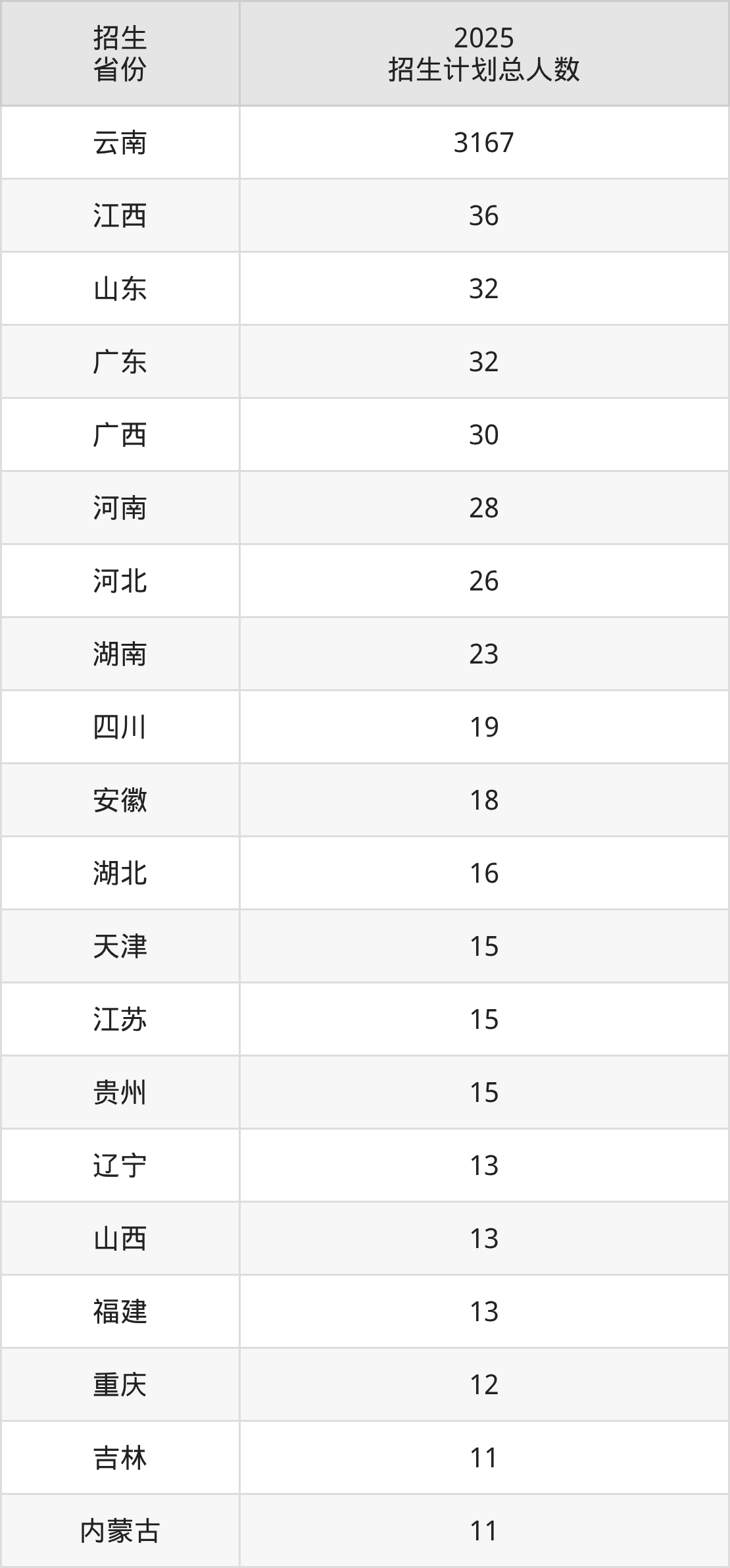 2025年昆明医科大学面向全国29个省市开展本科招生;招生专业共31个,招生人数共3621人。2025年在云南省招生计划总人数是3167人,其中,昆明医科大学在云南省招生人数最多的是临床医学。昆明医科大学在各省具体招生人数情况如下表。